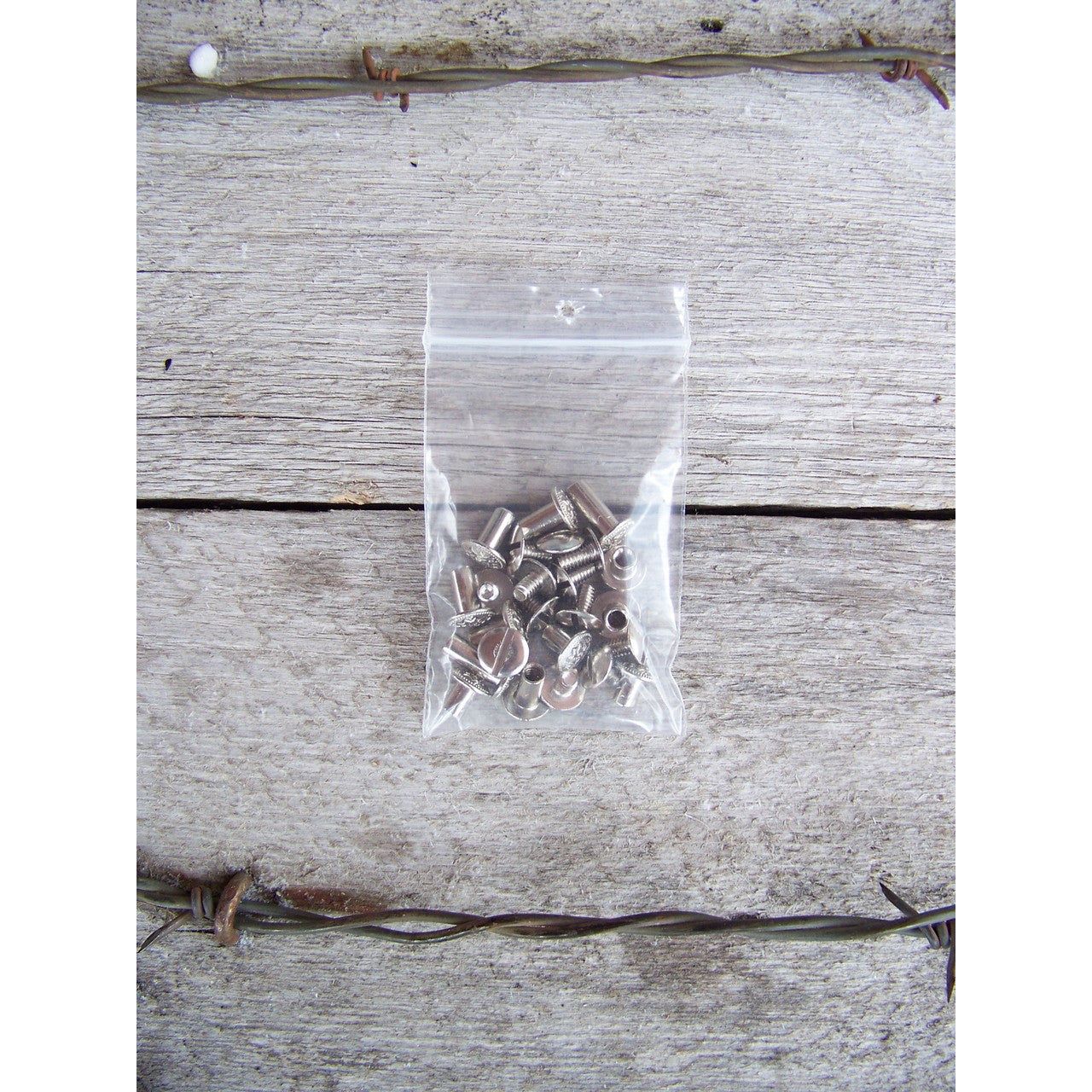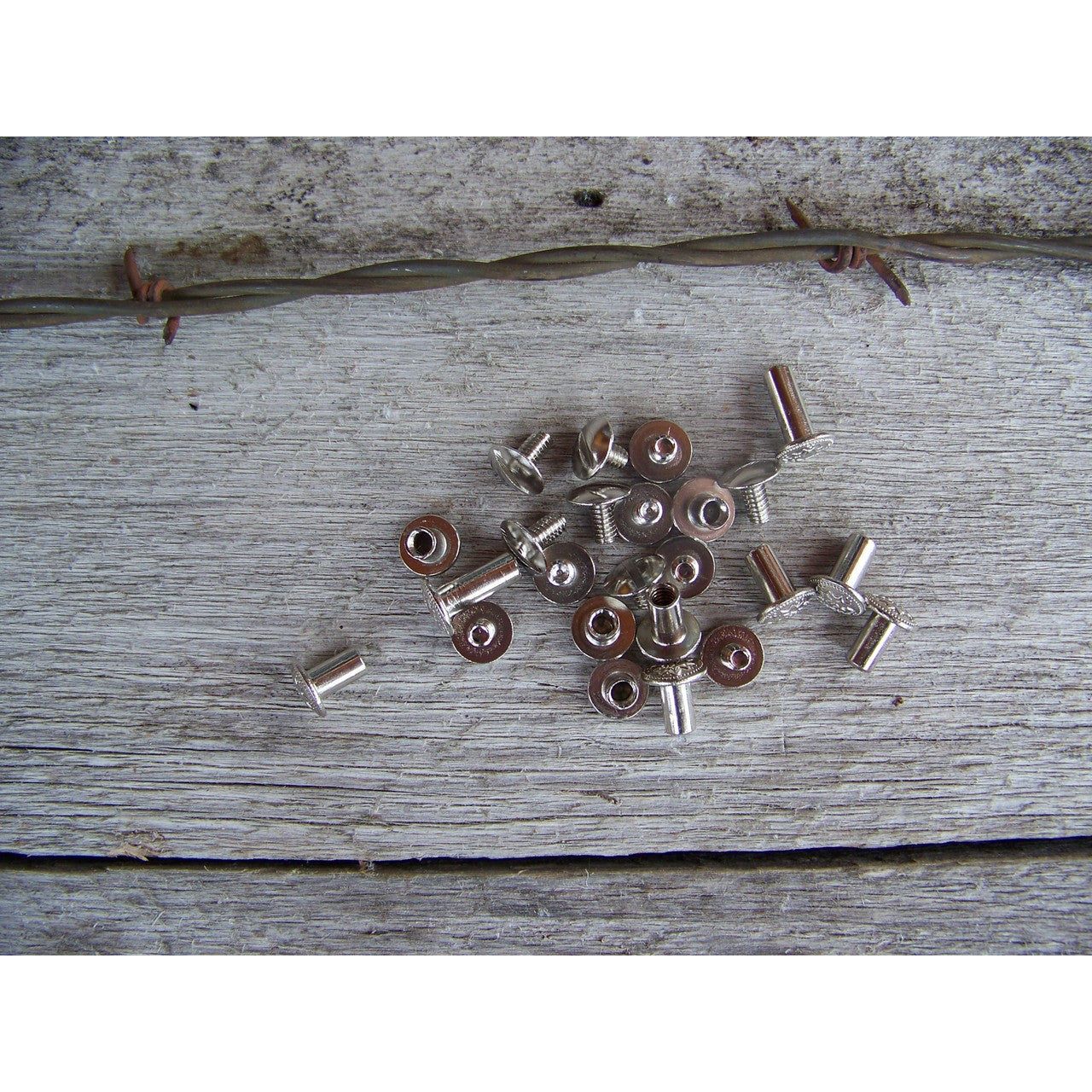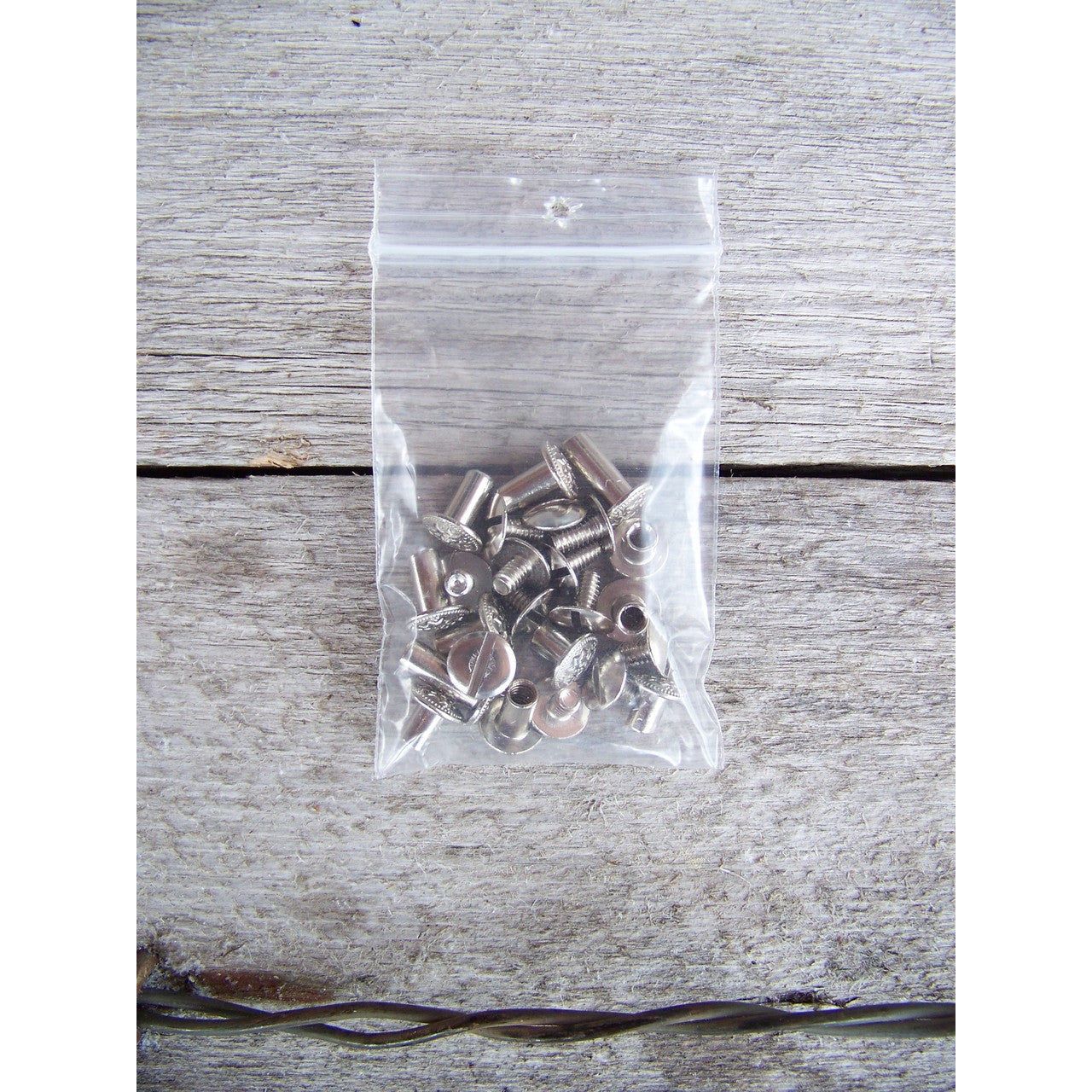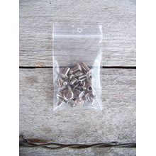 One package of chicago screws containing 12 sets of assorted sizes.  Non-rusting nickel on brass finish.