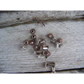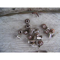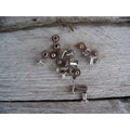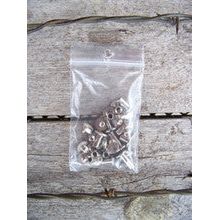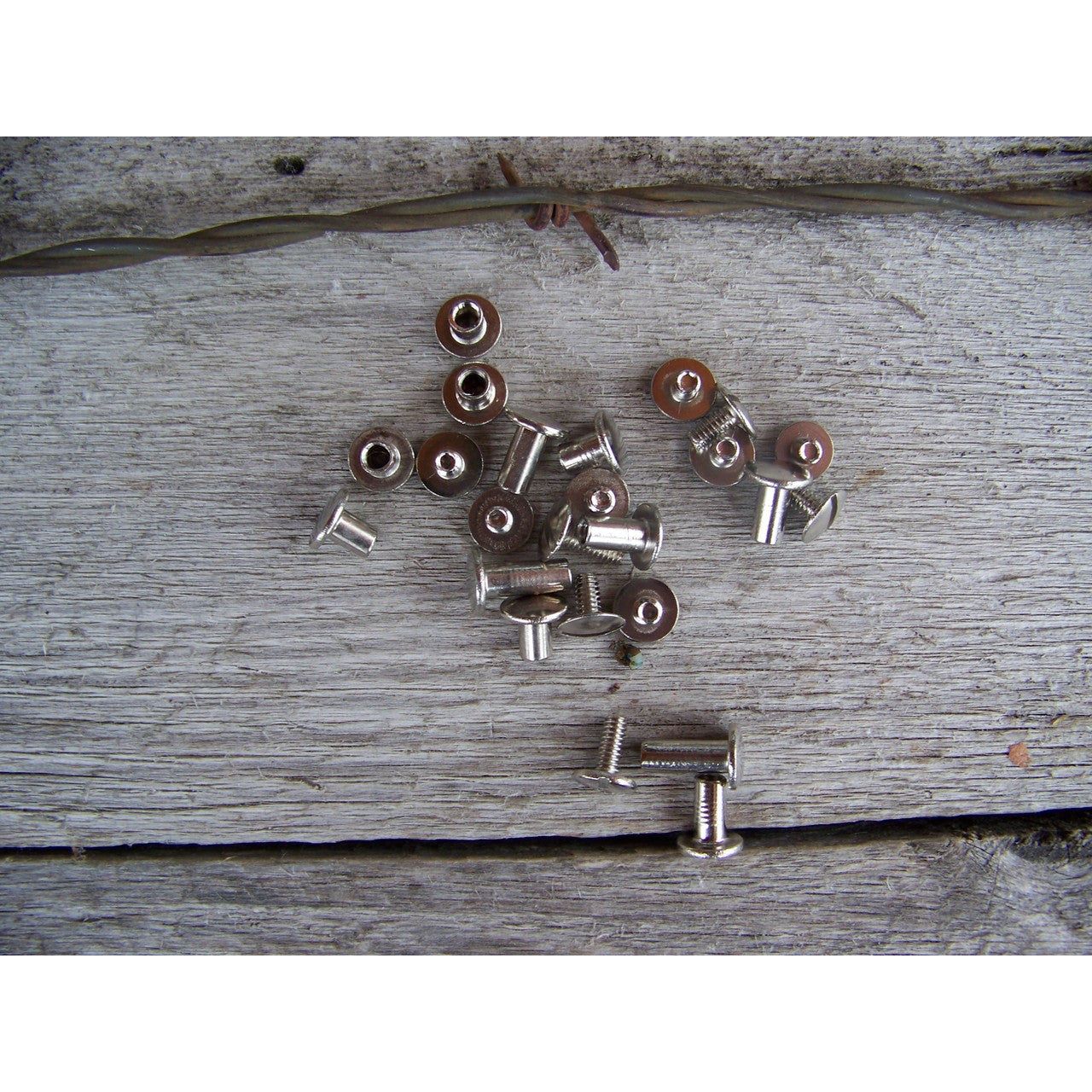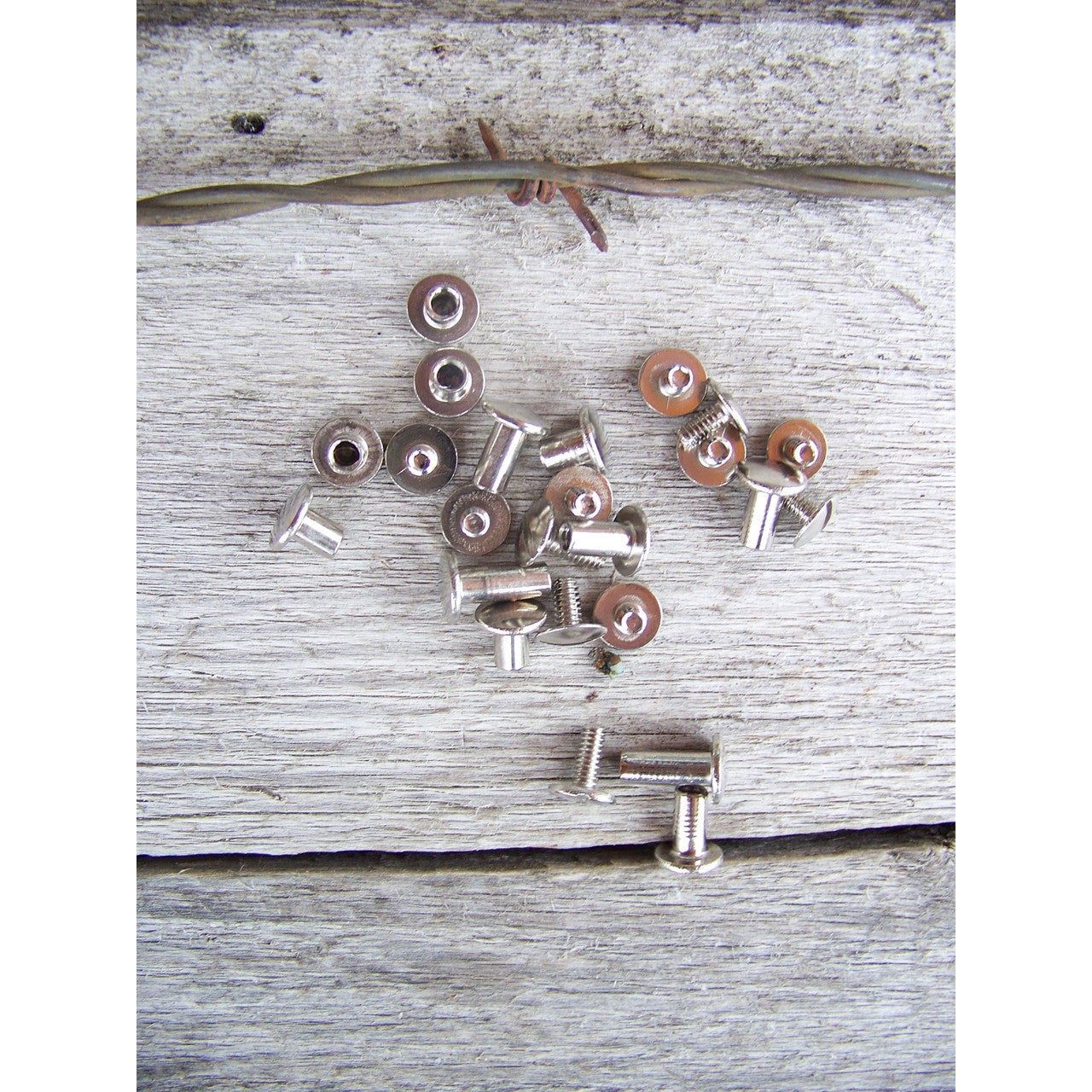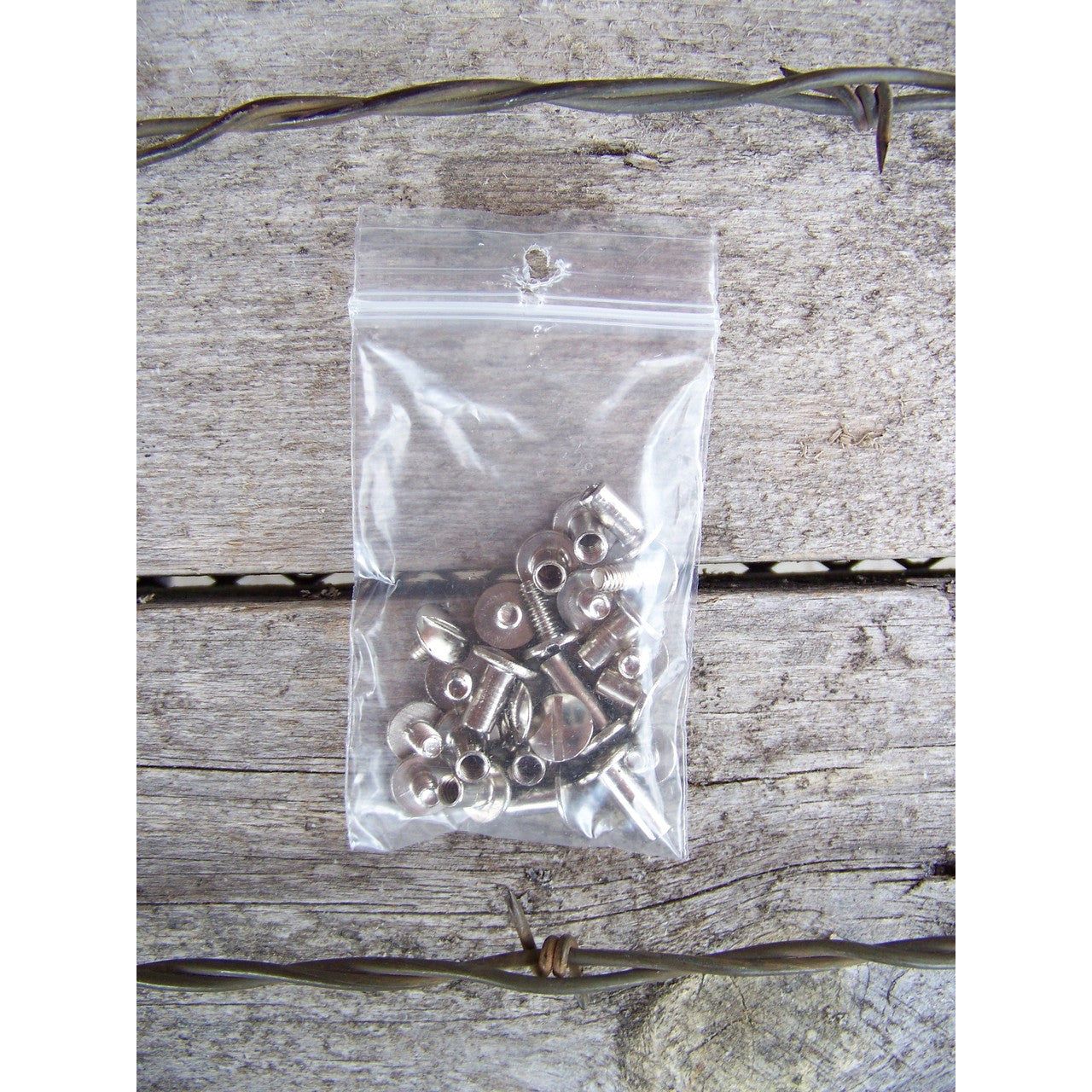 One package of chicago screws containing 12 sets of assorted sizes.  Non-rusting nickel on brass finish.  Please choose either plain heads or embossed heads when ordering in your PayPal notes so I can send you the ones you want!
