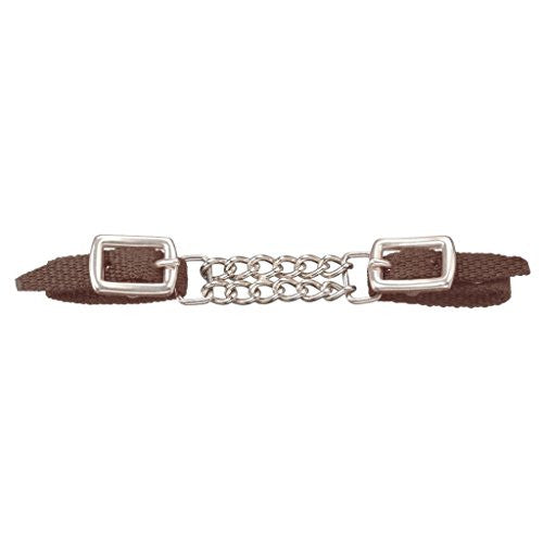 This strong nylon curb strap features nickel-plated double chain center with fully adjustable square buckle ends, 3 holes on each side. 1/2" wide, Adjusts 8 1/2" to 9 1/2" to fit most minis. 2 3/4" double chain center.