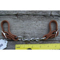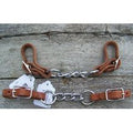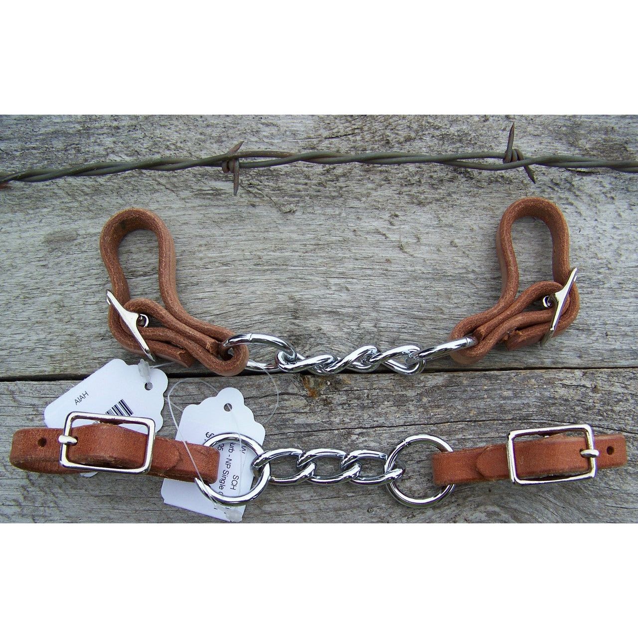Short link curb chain with 1/2" harness leather ends. Nickel plated chain and center bar buckles.