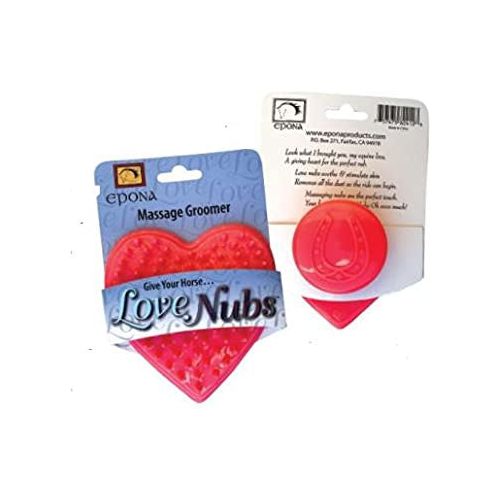 Massage groomer with nubs to remove caked mud. Stimulates and soothes the skin. Handle makes it easy to hold.