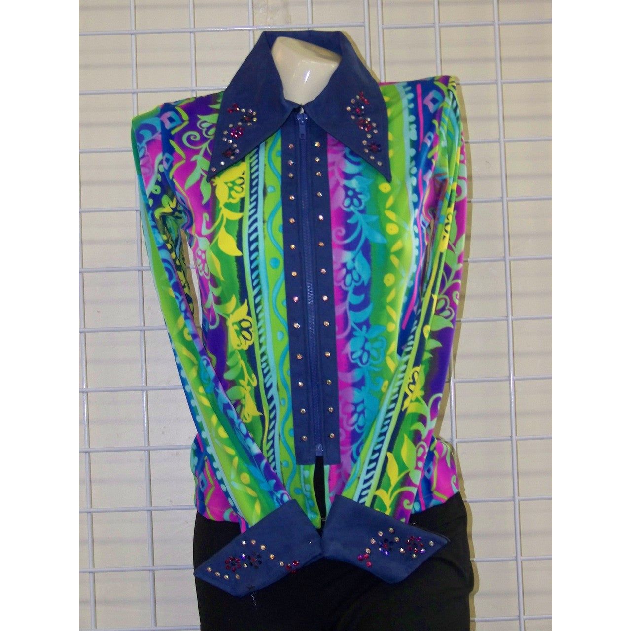 This custom western pleasure blouse is versatile and will work for any western events! The multi-colored blouse is perfect for a youth! The blouse has blue microsuede collar, cuffs, and placket and is adorned with colored crystals. Size extra small.