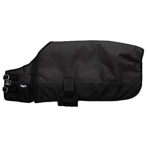 Tough1® 600D dog blanket is made of a 600 denier waterproof ripstop poly outer shell with a breathable 210 denier lining and 150 gram poly fill. Features include: single buckle front (double buckle on larger sizes), adjustable belly-wrap with "Quick Grip" closures, cut out for tail, and shoulder gussets that allow freedom of movement.