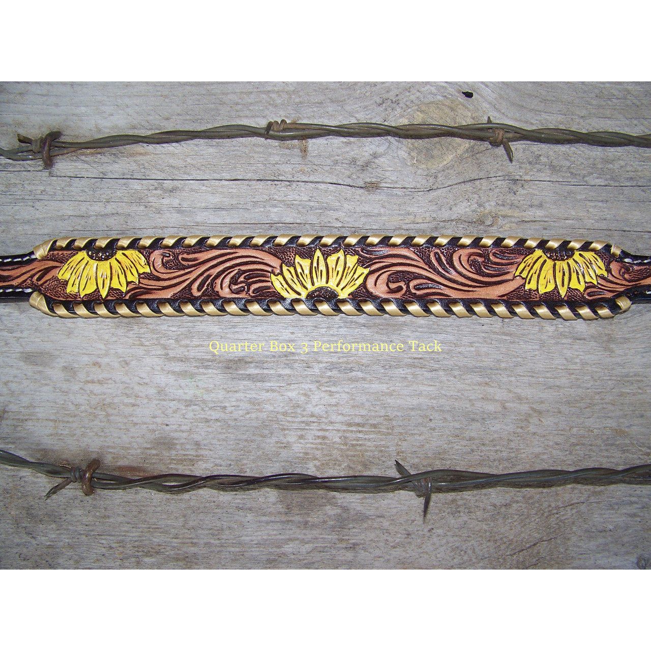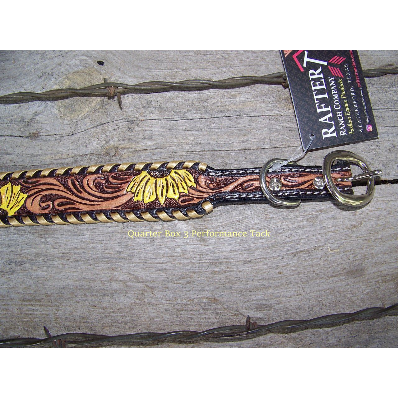 Dog collar with sunflower tooling in two tone finish. Painted sunflower and metallic whipstitch by Rafter T Ranch Company