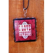 Pendant #8 - Double dominos on this one. You have a 10 and a 4 each spot covered in clear rhinestones. Each side of the dominos has 4 additional rhinestones. The front of the pendant is "I Love Cowboys" . Fun, fun, fun!