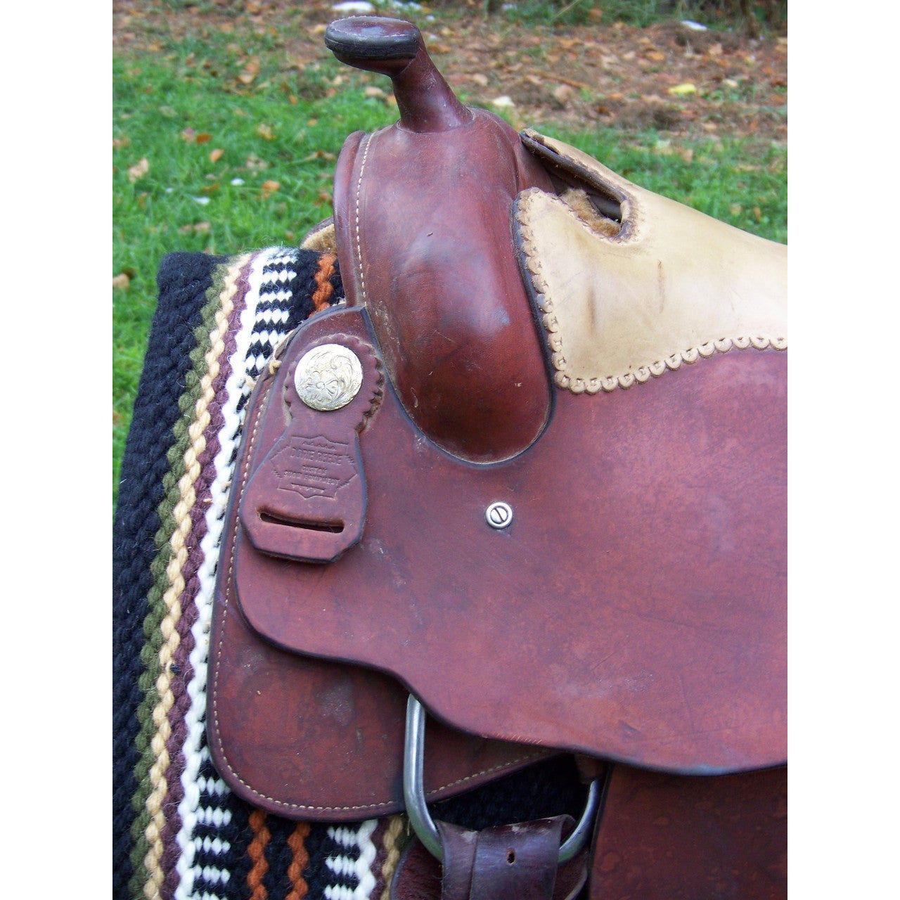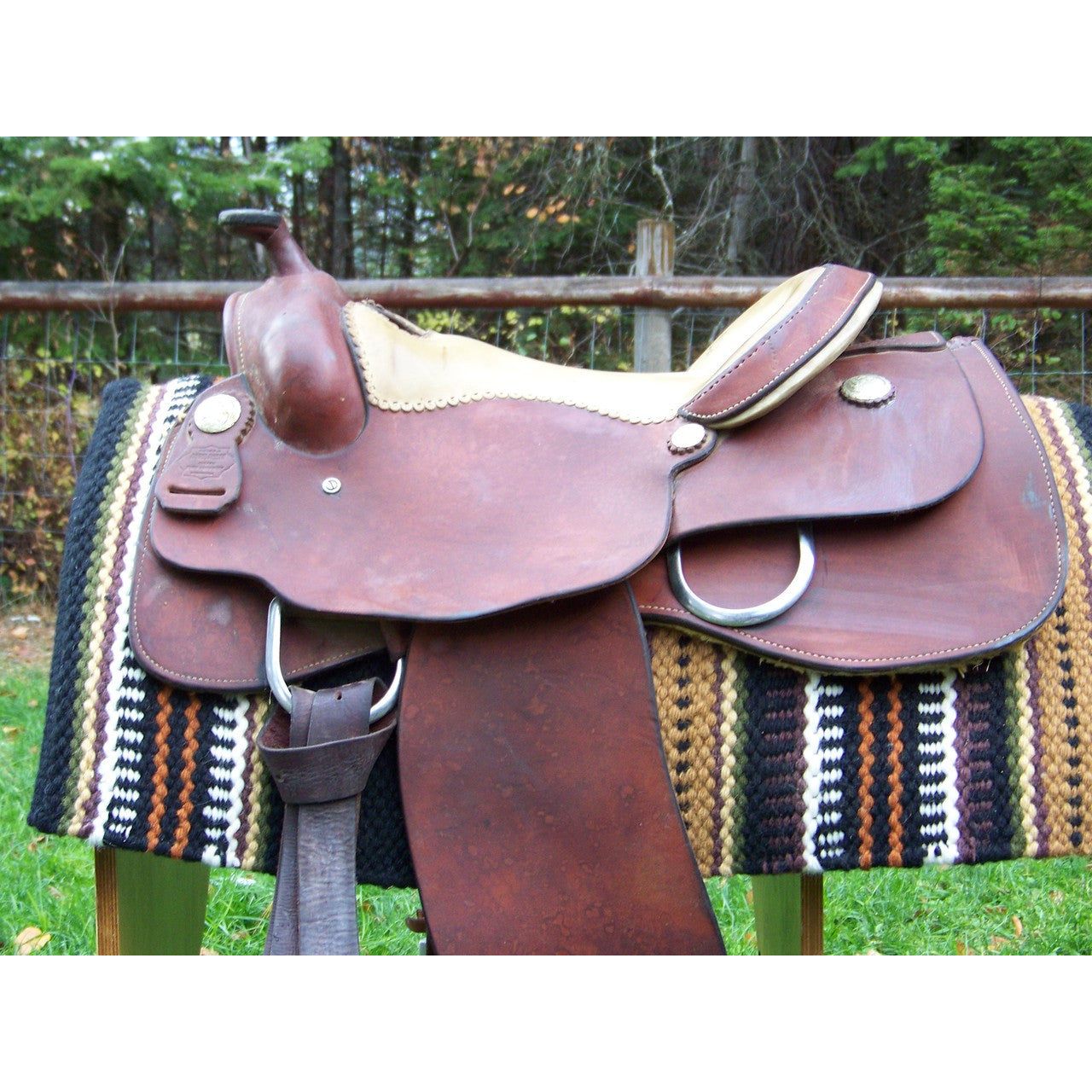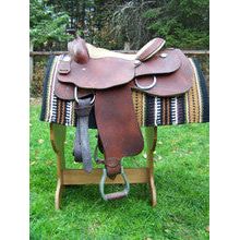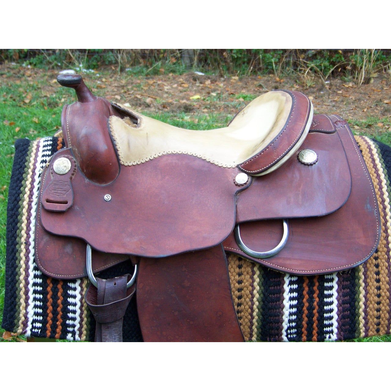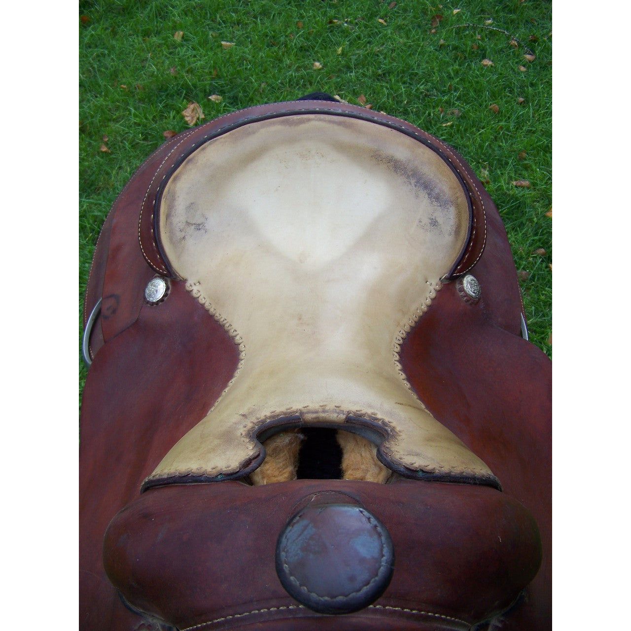 Love this work saddle as it fits close to the horse, lets you put your leg around them. Recommend for the older horses just due to being smooth leather, you don't get the stick that a rough out gives you. Seat measures 16.5" to the seam but it sits 15.75". Full quarter horse bars on this one. This is my own personal saddle and is not a consignment. Cinch not included. Shipping in the US will run $60. Shipping outside the US is at cost plus insurance. We accept PayPal and credit card.