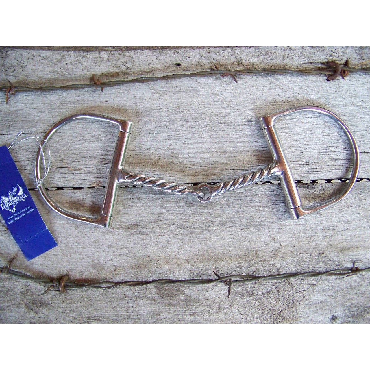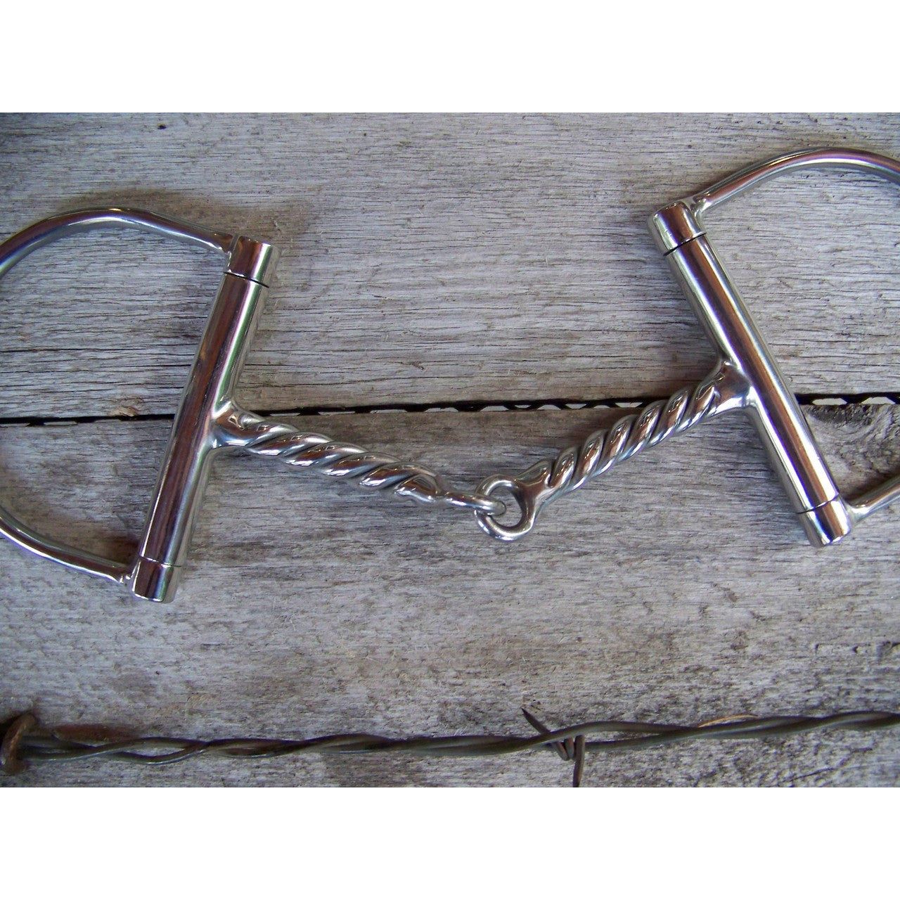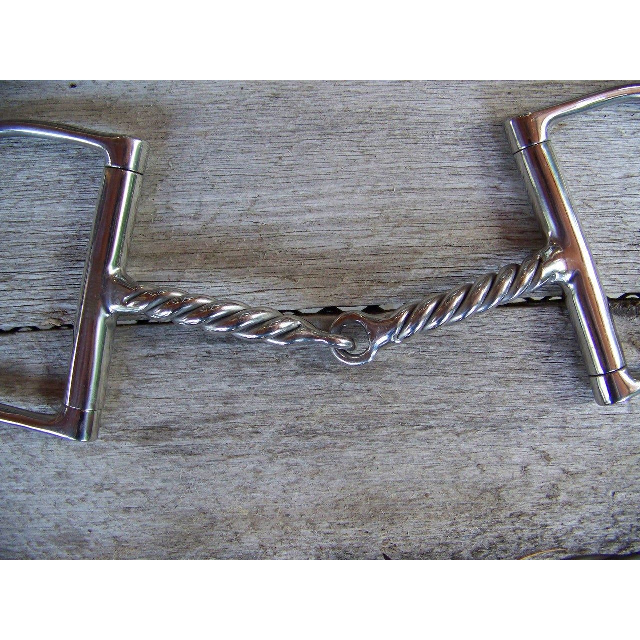 Large dee stainless steel snaffle measures 5.25 inches and has a twisted bent wire mouth.