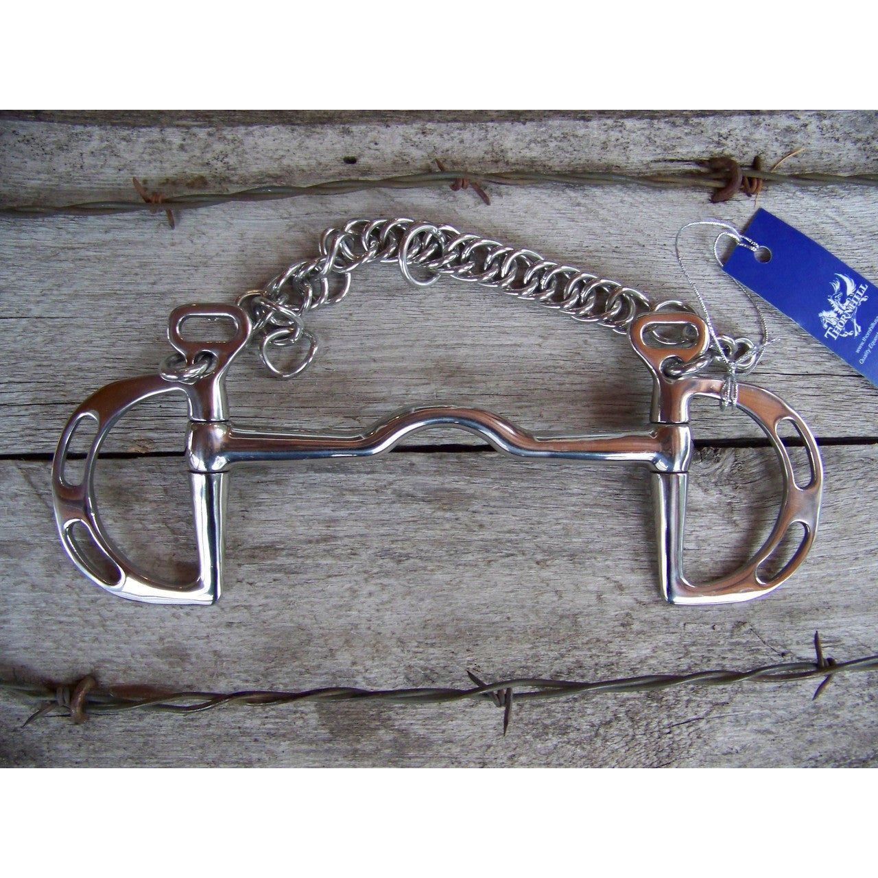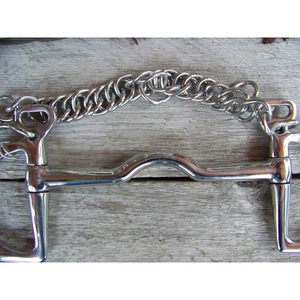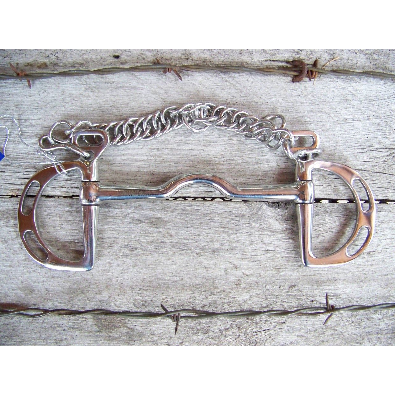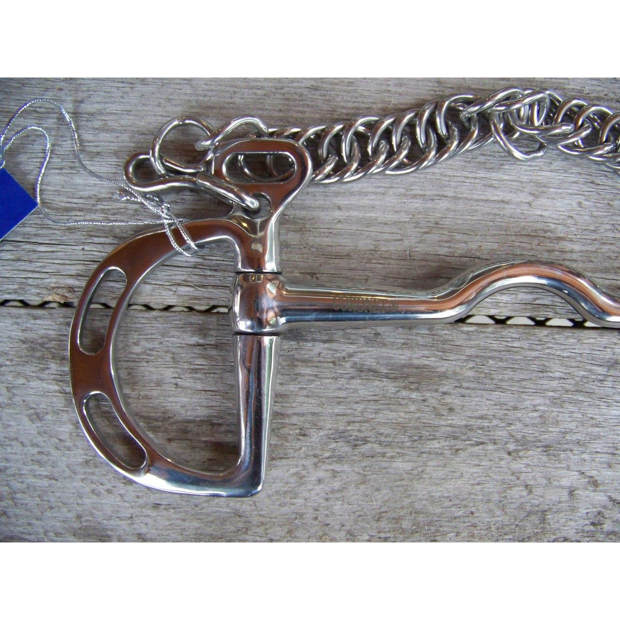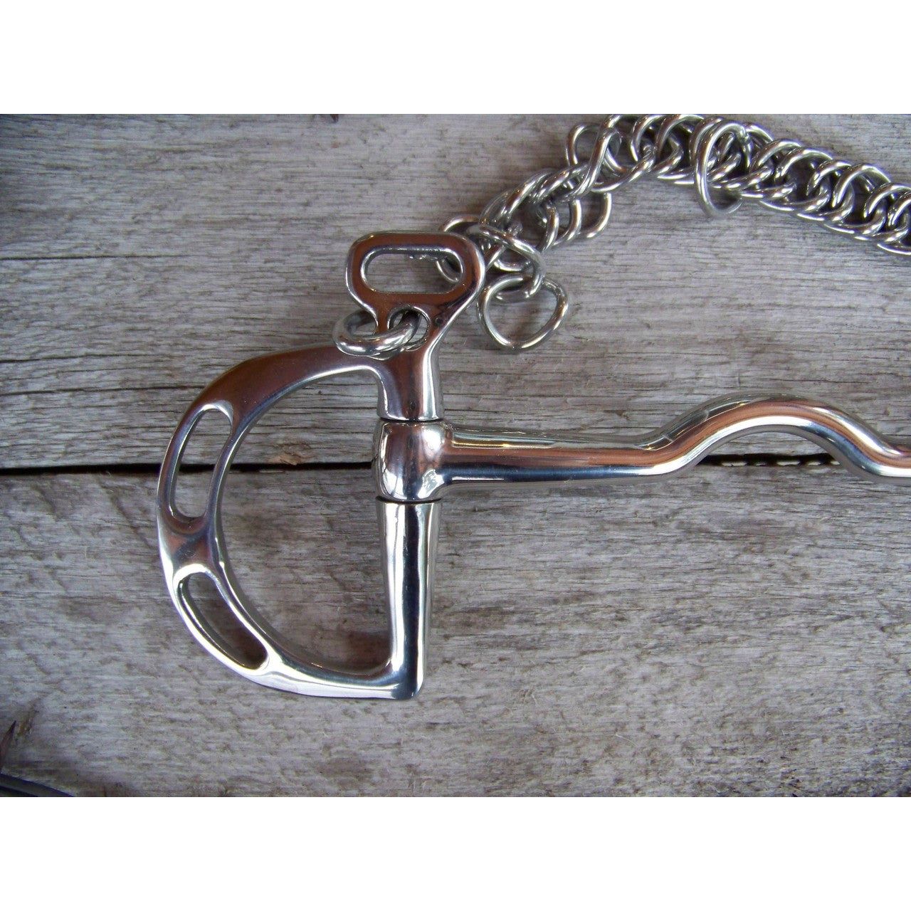 Stainless steel slotted kimberwick with a low port 5.5" mouth piece. Comes with stainless steel curb and curb links.