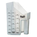 The perfect poly feed scoop with easy to read measurements on side showing weights of 1/2lb to 3lbs of pellets, 1/2lb to 2 1/2 lbs of sweet feed and 1/2lb to 2lbs of oats.