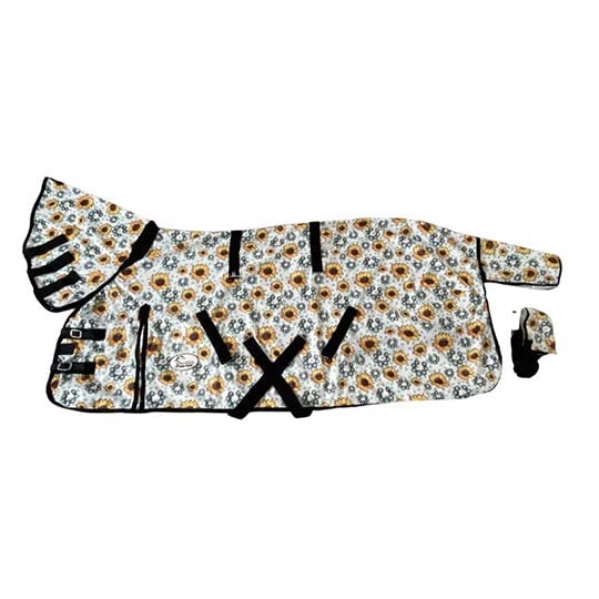 Sunflower squash blossom print Light weight fly sheet with black trim. Light weight fly sheet constructed of durable mesh with nylon trim . Open front design with two adjustable nickel plated buckles, attached full neck hood, mesh belly band, gussets at shoulder and flank for extra movement and adjustable rear leg straps and tail guard.