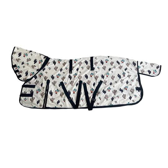 Sunset Cactus print Light weight fly sheet with black trim. Light weight fly sheet constructed of durable mesh with nylon trim . Open front design with two adjustable nickel plated buckles, attached full neck hood, mesh belly band, gussets at shoulder and flank for extra movement and adjustable rear leg straps and tail guard.