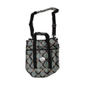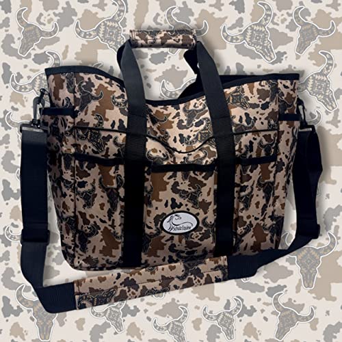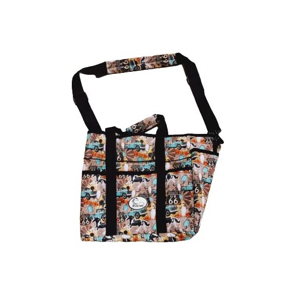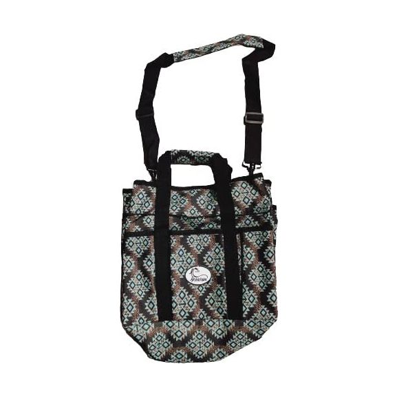 6 outside pockets to hold sprays, brushes and other grooming equipment. The nylon elastic bands hold taller items upright. Two tall side pockets to hold items. The inside features an open center for maximum storage room. Two handles and a padded adjustable/removable shoulder strap