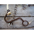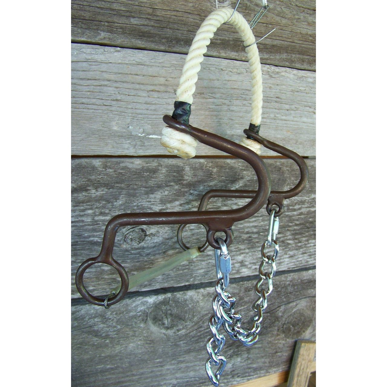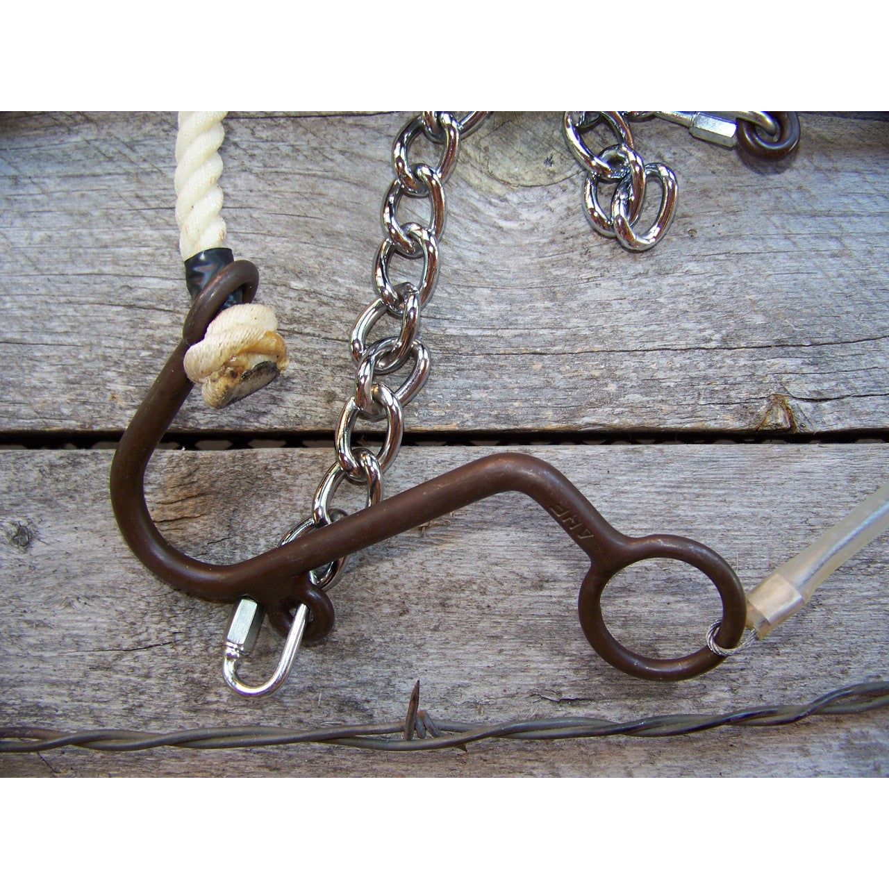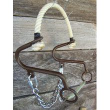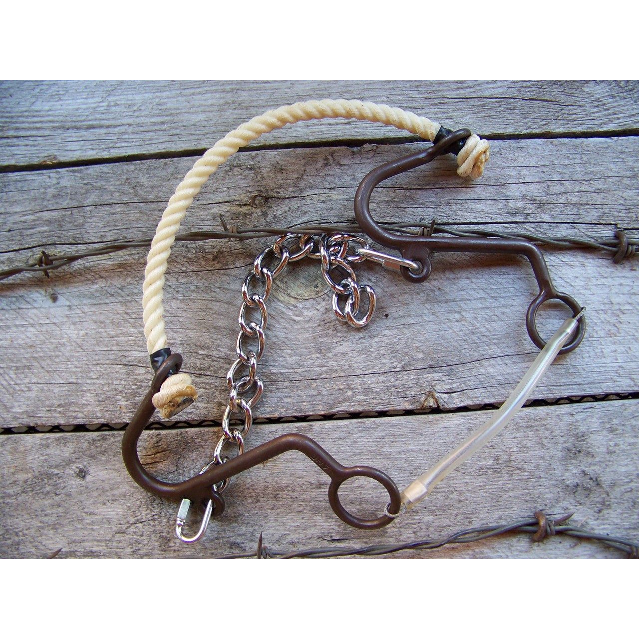 Antique brown little S Hackamore with rope noseband and stainless steel curb and quick links.