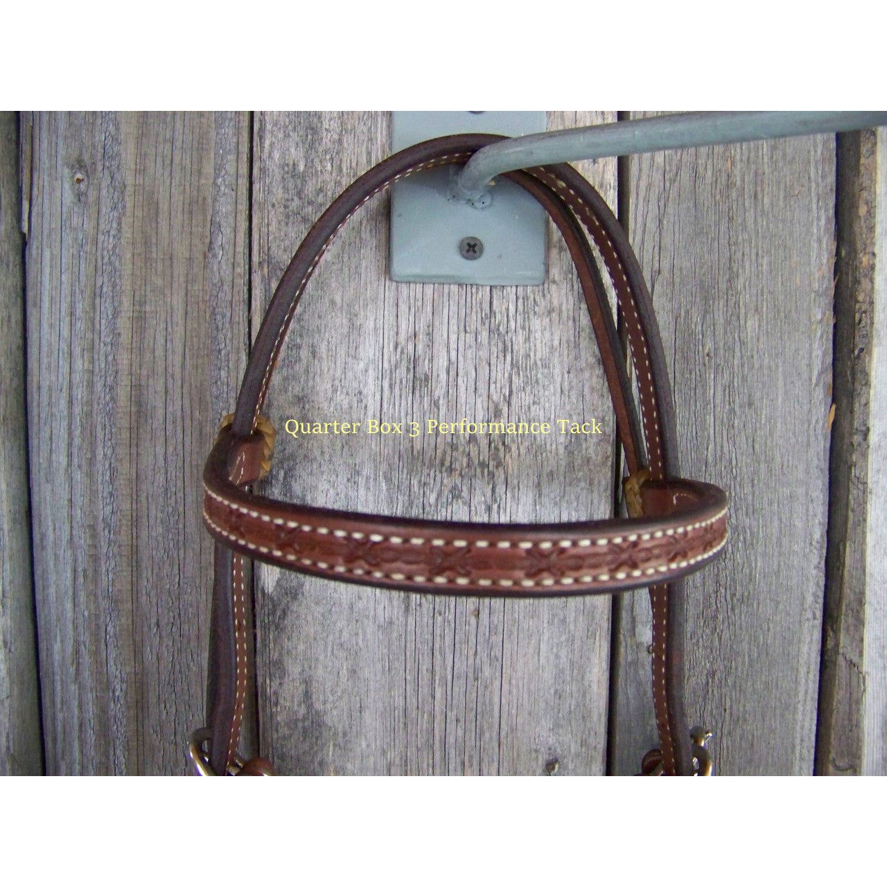 Nice browband headstall that is stitched and lined in dark oil. Rawhide braided keepers and tooled.
