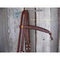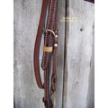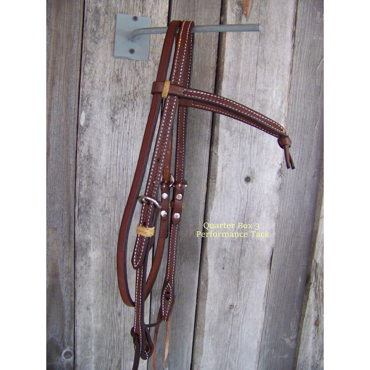 Stitched and lined futurity knot browband headstall features rawhide braided keepers.