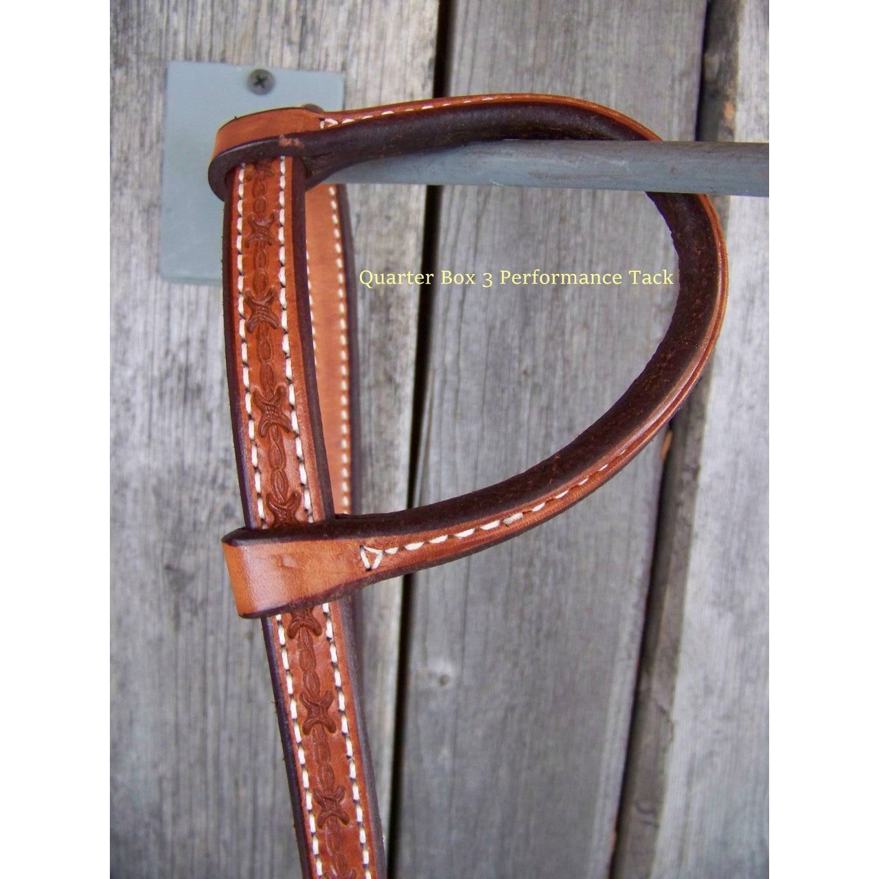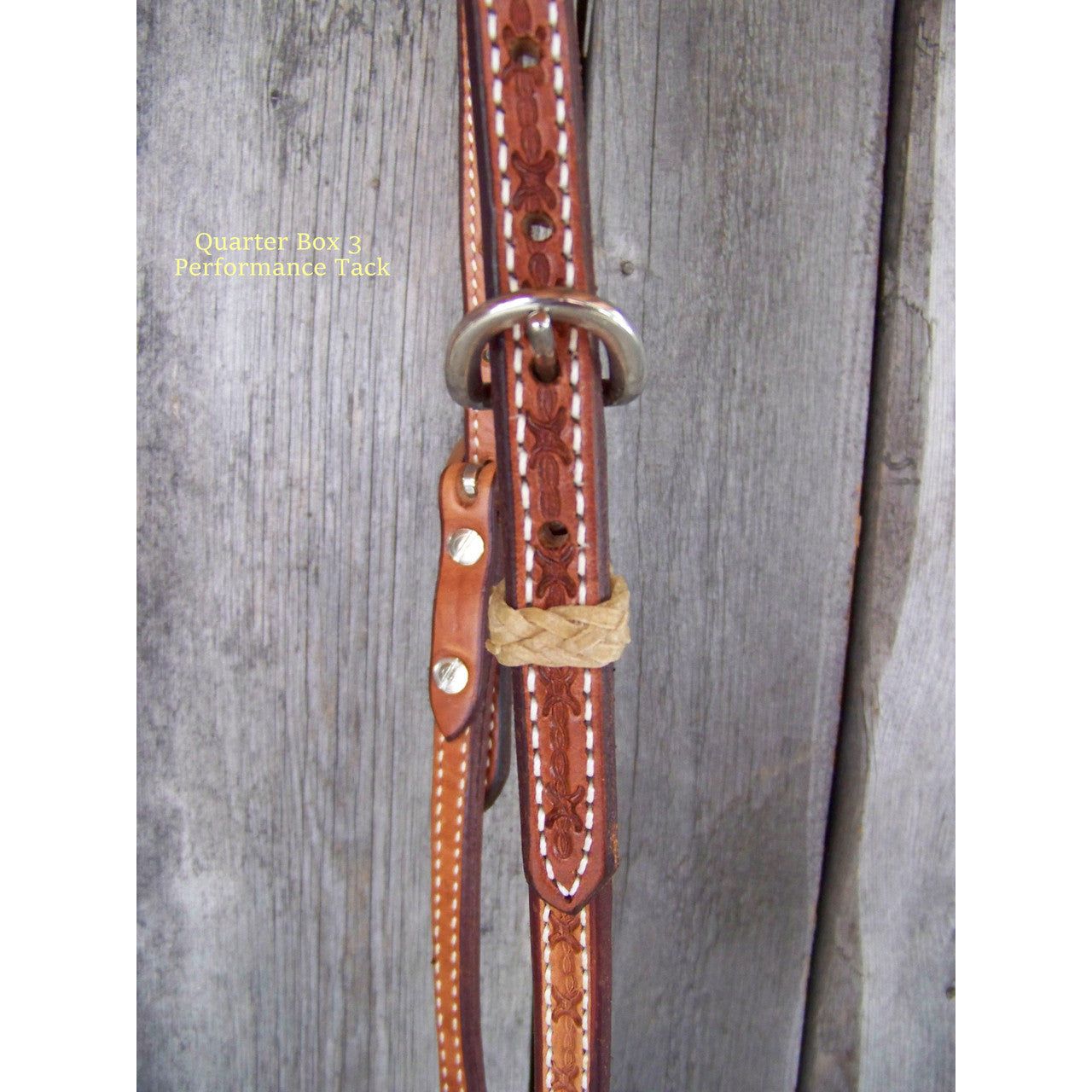 Nice one ear headstall that is stitched and lined in natural coloring. Rawhide braided keepers and tooled.