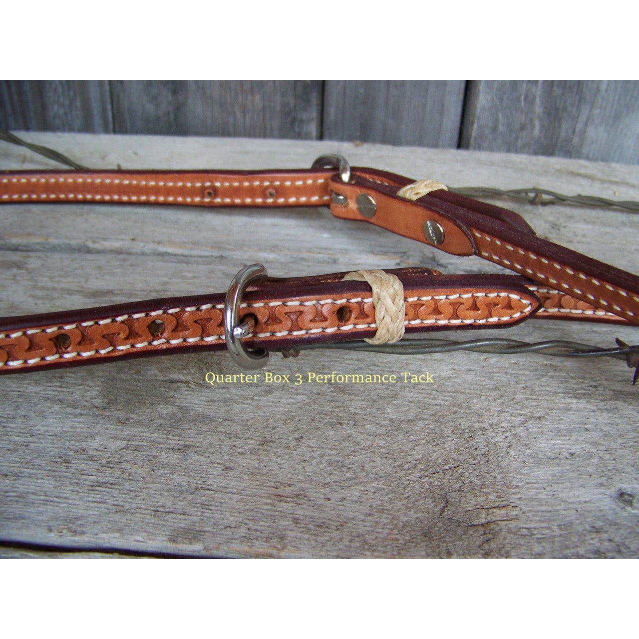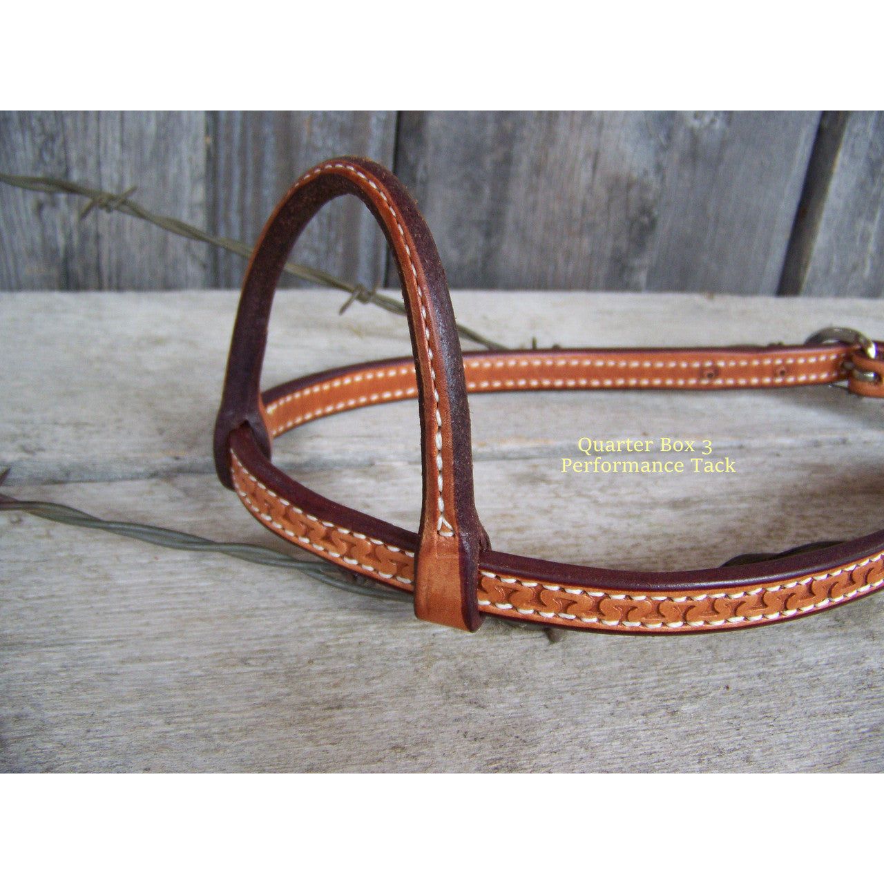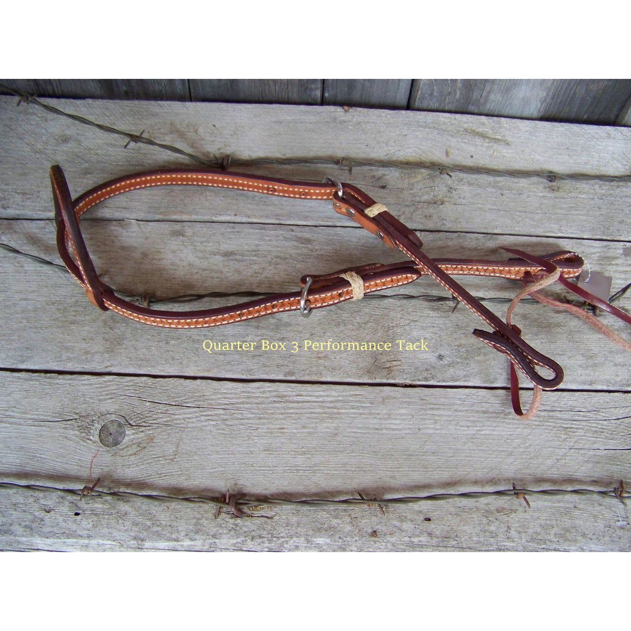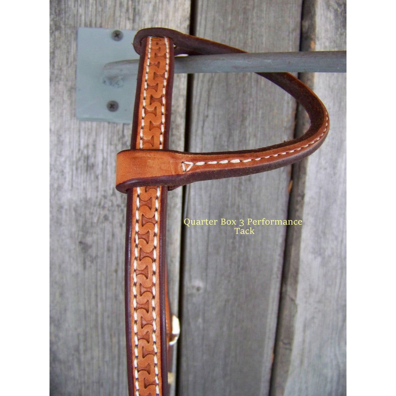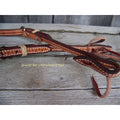 Nice one ear headstall that is stitched and lined in natural coloring. Rawhide braided keepers and tooled.