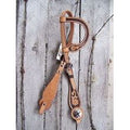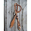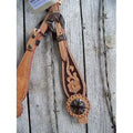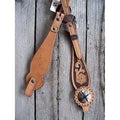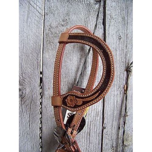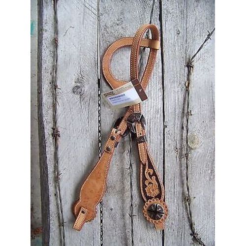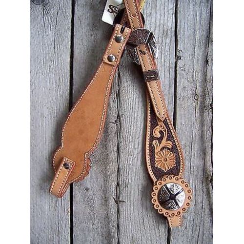 One ear headstall has raised floral design enhanced by a dark brown background and attractive buckle, loop and concho. Imported.