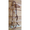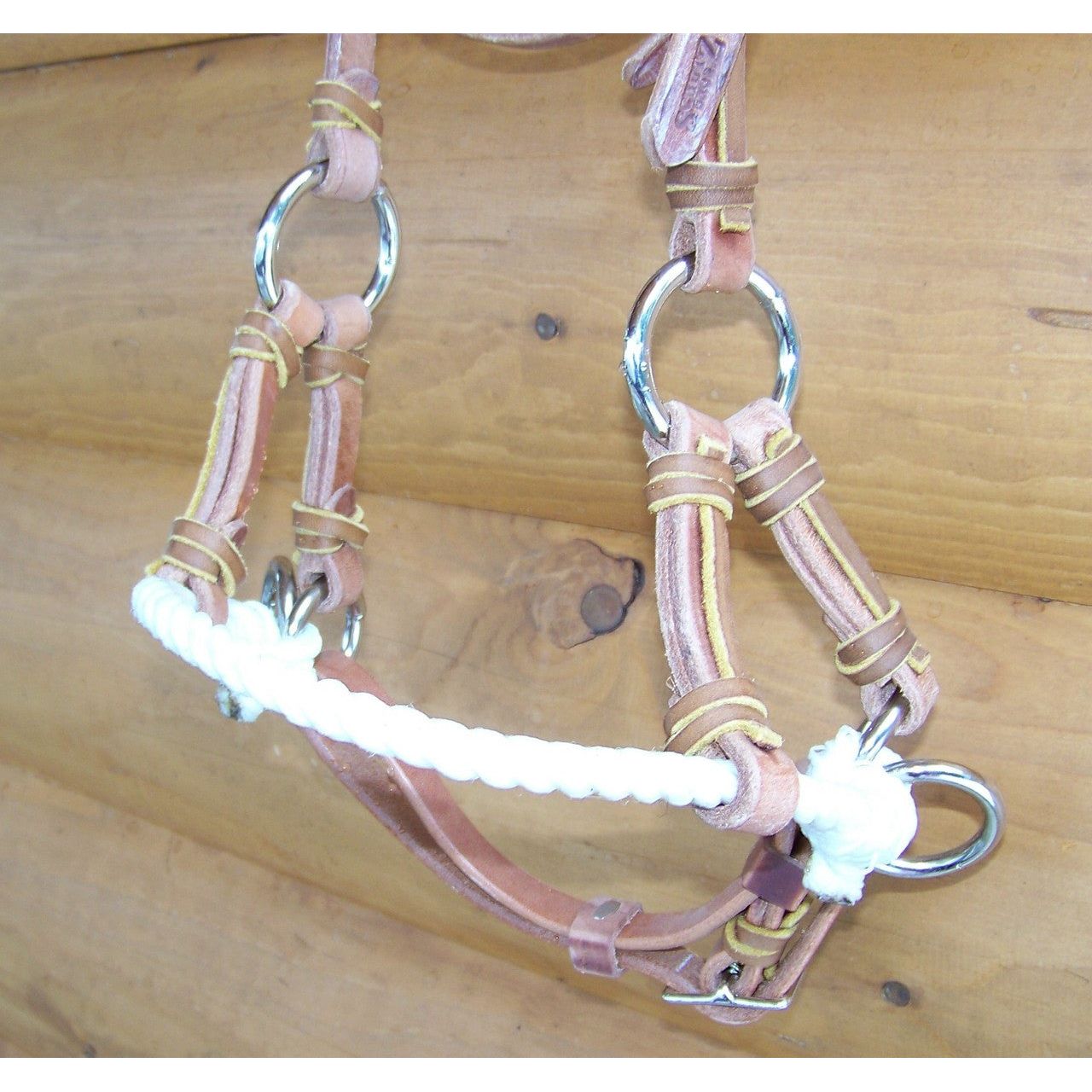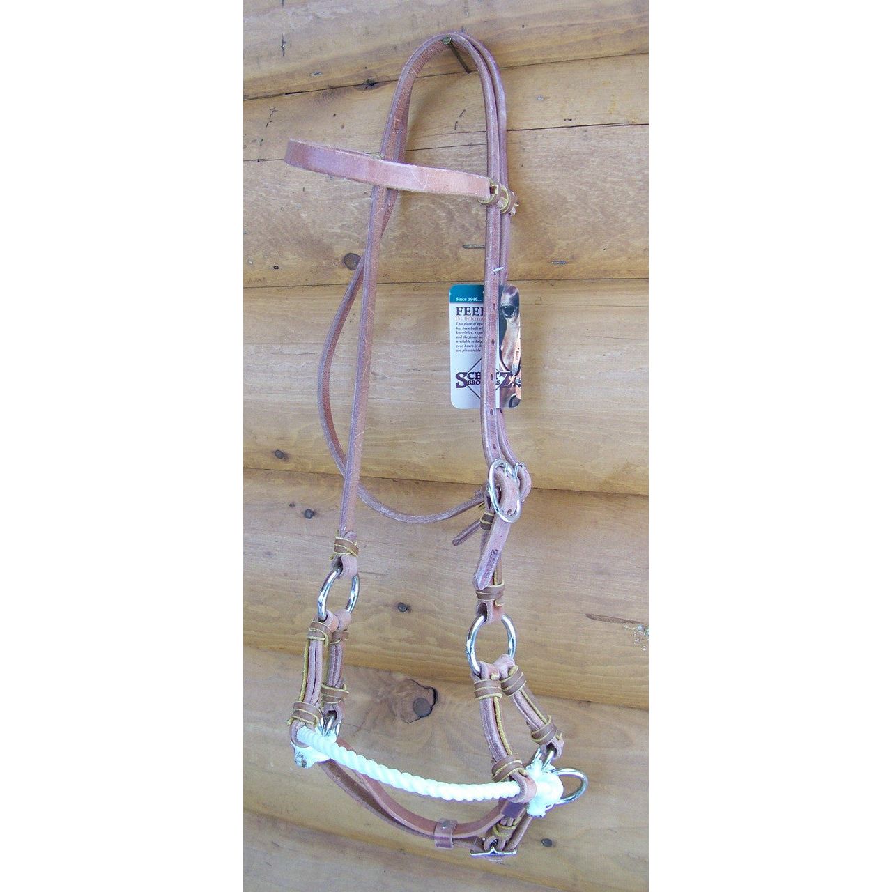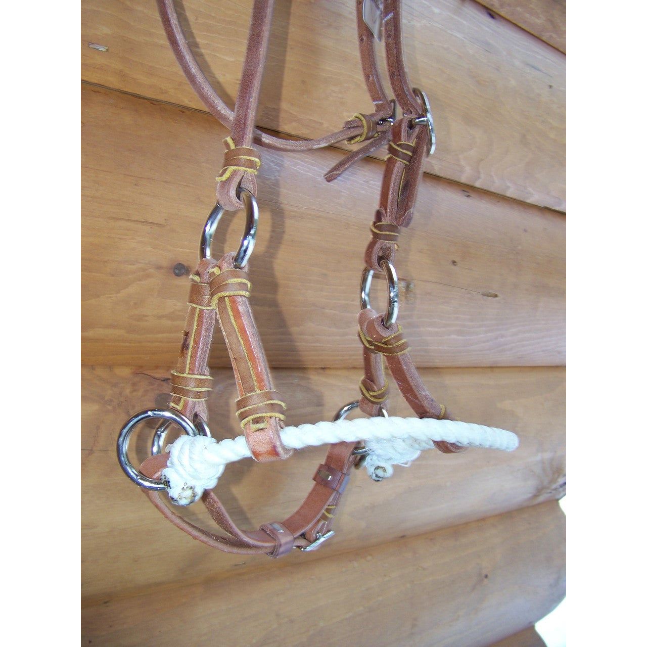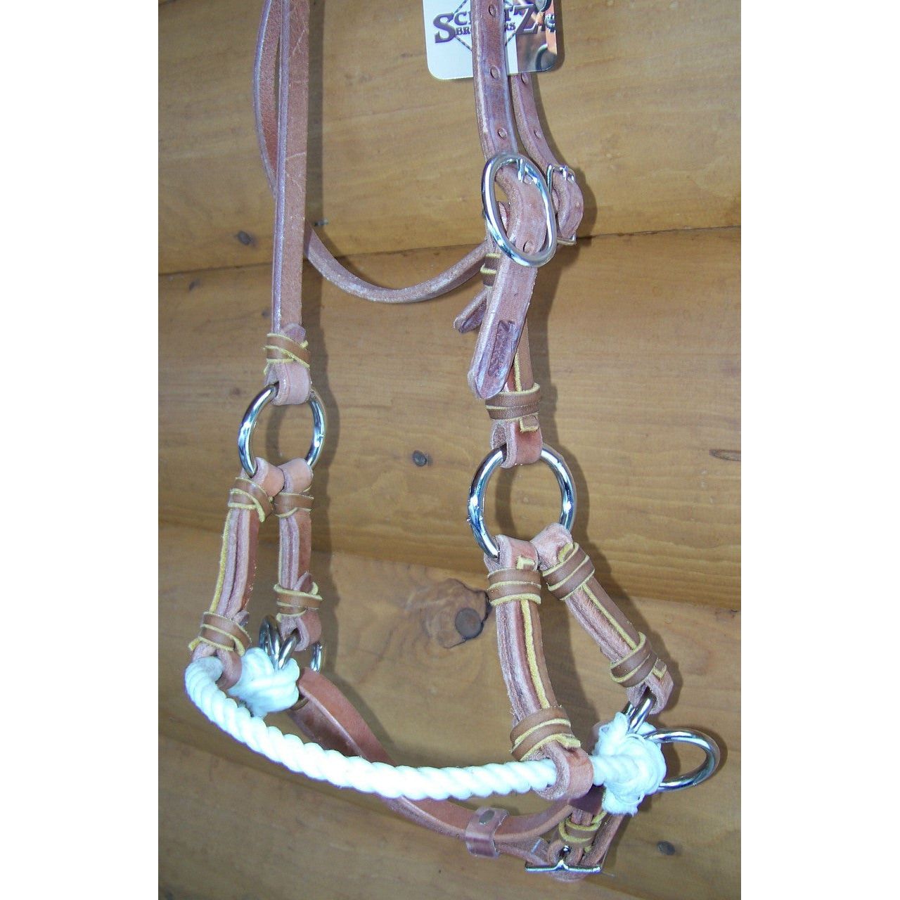 Harness leather headstall with a rope nose sidepull. Made by Schutz Brothers in the United States. Stainless steel hardware to prevent rusting. Adjustable cheek, throatlatch, and under the chin.