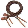 5/8" x 8' cord split reins with leather slobber straps accented with barbwire tooling. Black or brown.