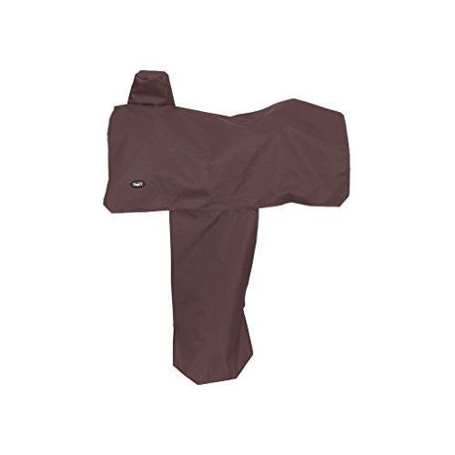 A full sized saddle cover designed to fit completely over western saddles to keep dust and light from damaging your valuable saddle. Made of strong nylon featuring elastic straps in skirt corners and fenders to secure the cover to the saddle. A cut out pocket for the horn doubles as a storage tote. Just fold the cover into the horn pocket for quick and easy storage!