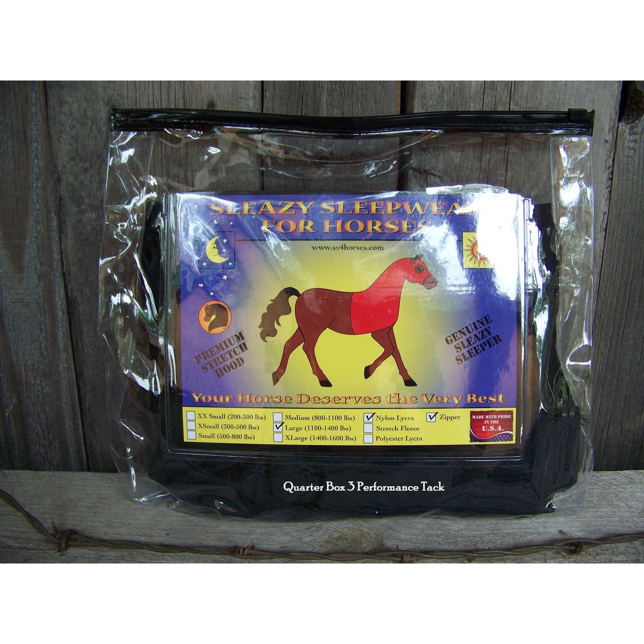 The Sleazy Stretch Hood, made from nylon or polyester spandex, is Sleazy Sleepwear for Horses' #1 selling item. It helps to train the mane, keeps the mane and forelock clean, smoothes the body hair and works great as a liner under heavier garments. The "Seamless Face" design eliminates any seams below the eyes for maximum safety. These hoods also feature: