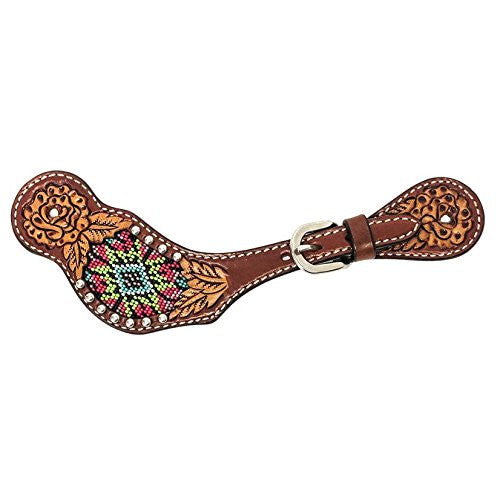 Ladies spur straps by Rafter T Ranch Company feature beaded inlay with rose and floral tooling, two tone leather finish and stainless steel spots.