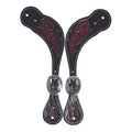 Distinctive black leather with chocolate brown floral tooling, feature stainless steel hardware.