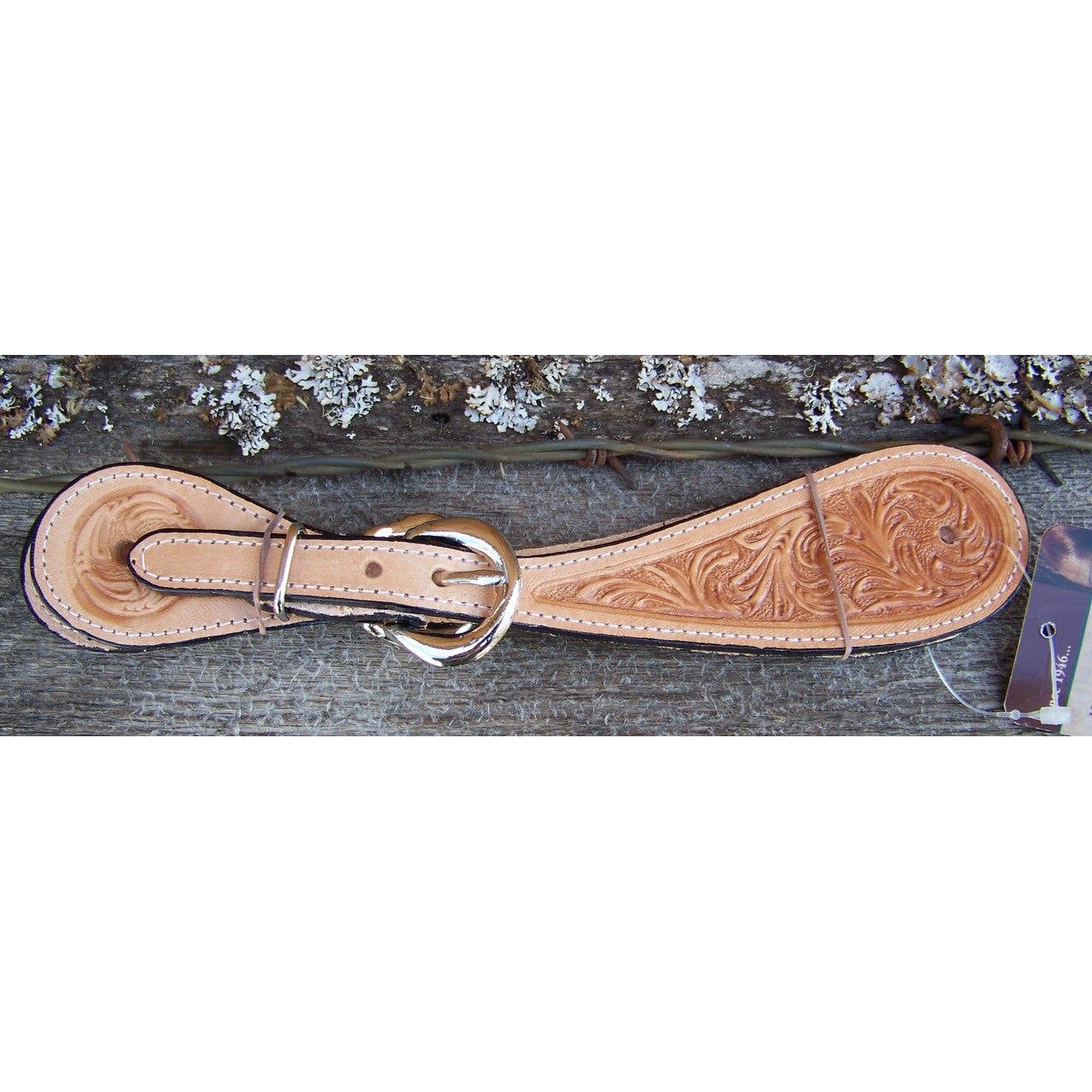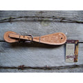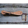 Simple ply leather spur straps embossed with floral or exotic patterns, then stitched. Floral straps have 5/8" nickle plated buckles and loops. Exotic straps have stainless steel center bar buckles.