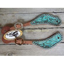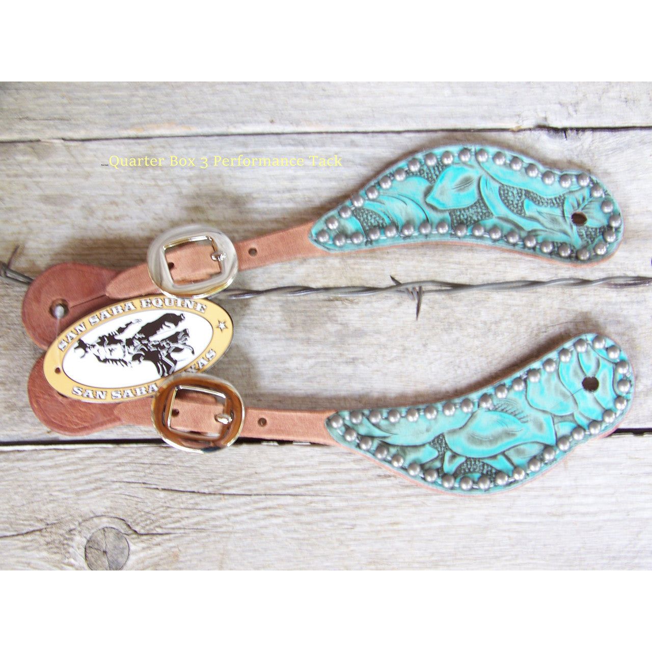Spur Straps - Harness Leather, Exotic Print, SS Dots (Adult - Antique Turquoise Western Tool)