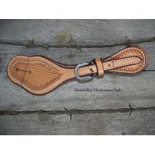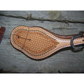 Basketweave tooled single-ply, stitched spur straps accented with a border of mini-spots.  Available in natural or chestnut finish in men's women's and youth sizes.  Stainless steel buckles.  (Check out the other listings for the color and size of your choice!!!!)