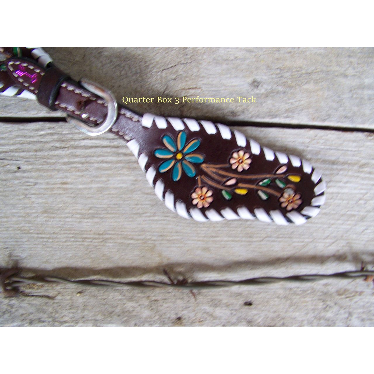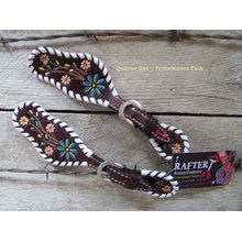 Kids spur straps in two tone finish with painted floral vine and white whip stitch by Rafter T Ranch Company.
