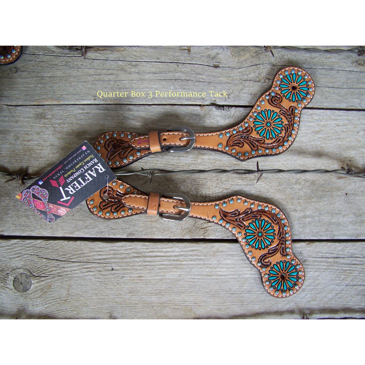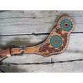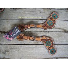 Ladies spur straps by Rafter T Ranch Company features turquoise hand painted sun spots, two tone leather tooling, and turquoise zuni dots.