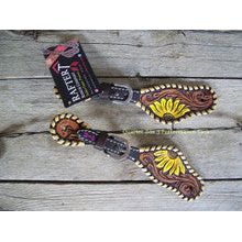 Rafter T Ranch Company spur straps feature two toned leather tooling, hand painted sunflowers, and metallic gold whip stitch.