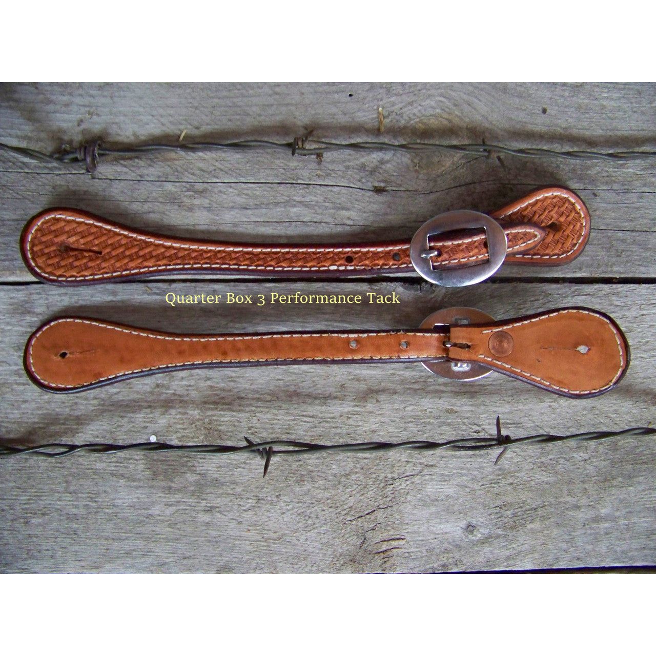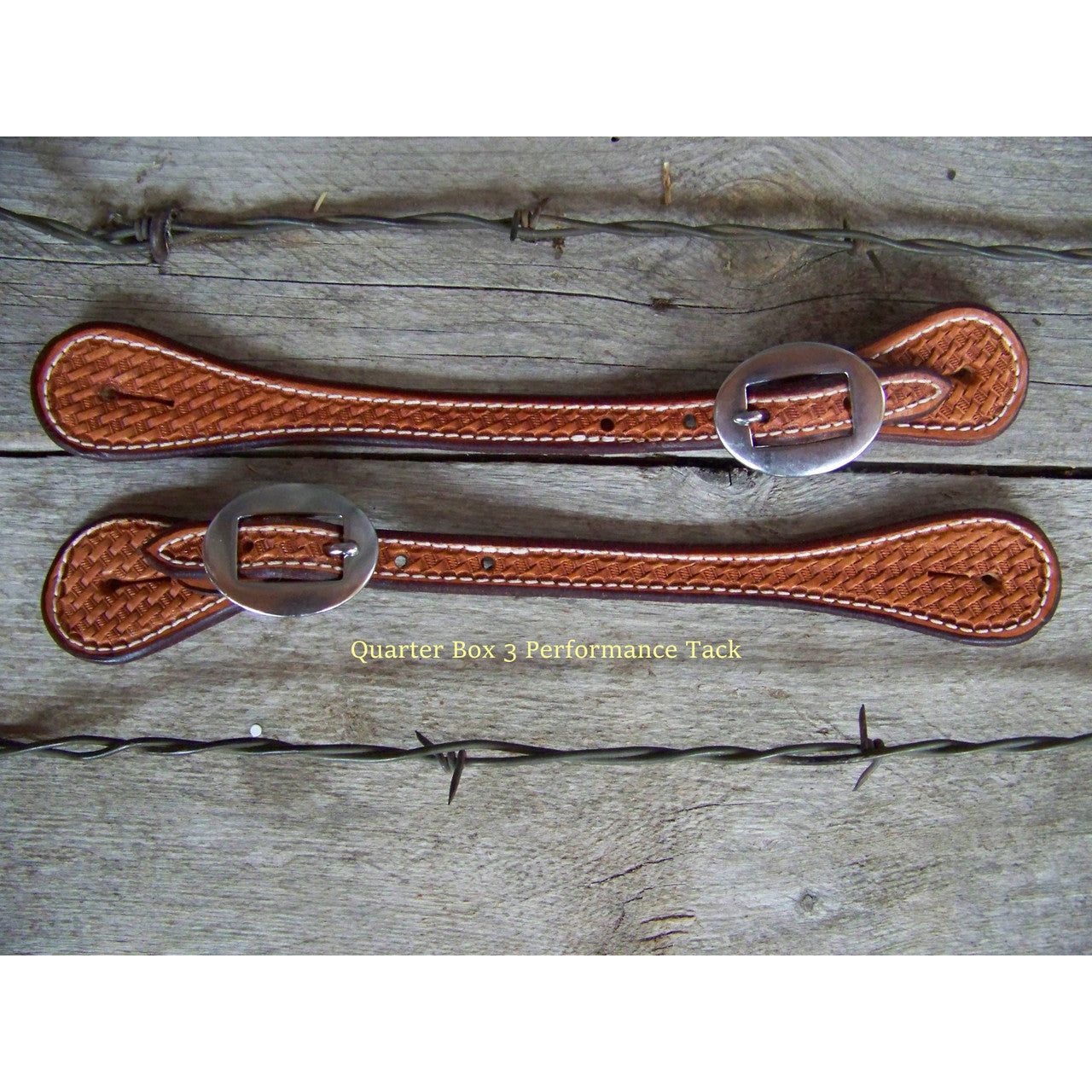 Men's straight basket weave stamped. Spur straps have stainless steel buckles. Available in natural and dark oil.
