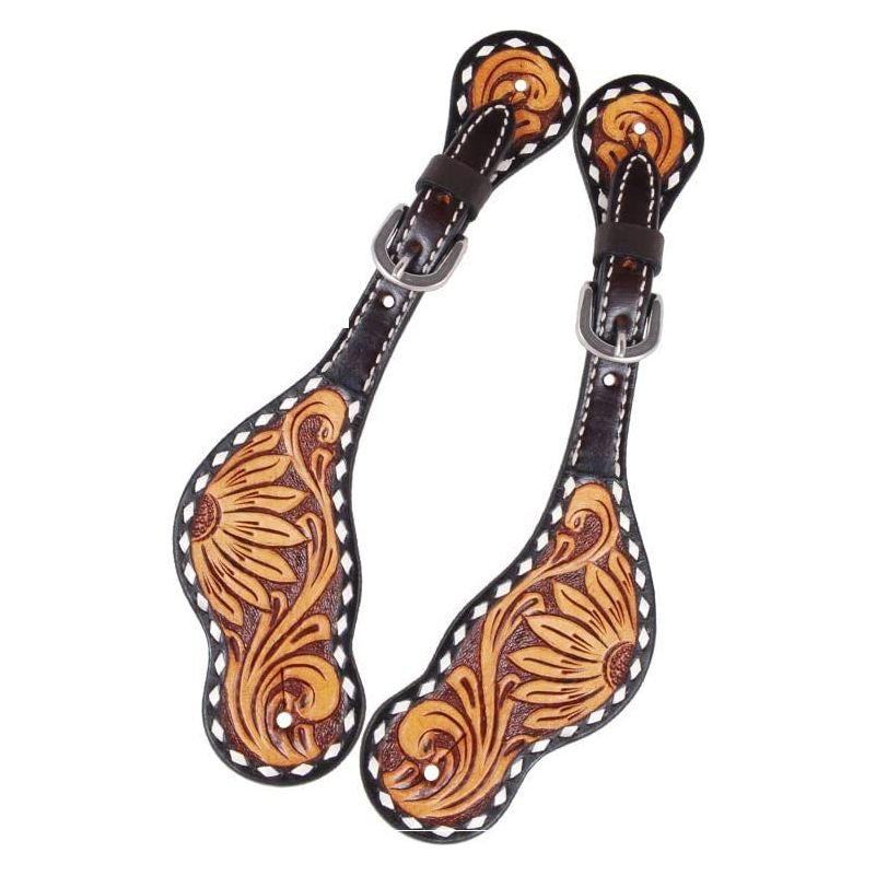 Ladies spur straps by Rafter T Ranch Company feature tooled sunflowers and white buckstitch. Two tone leather finish and stainless steel spots.