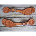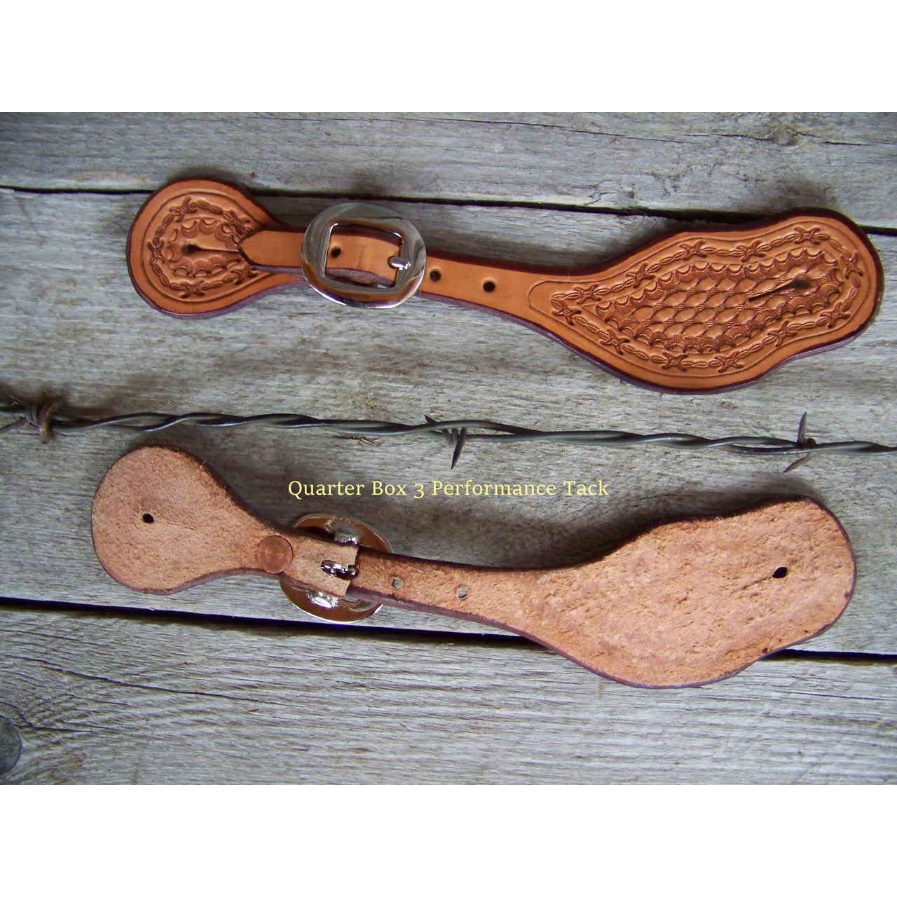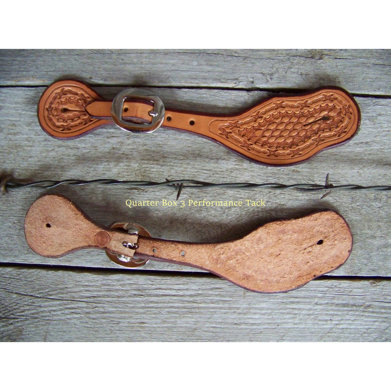 Ladies basket weave stamped spur straps feature barb wire trim tooling. Spur straps have stainless steel buckles. Available in natural and dark oil.