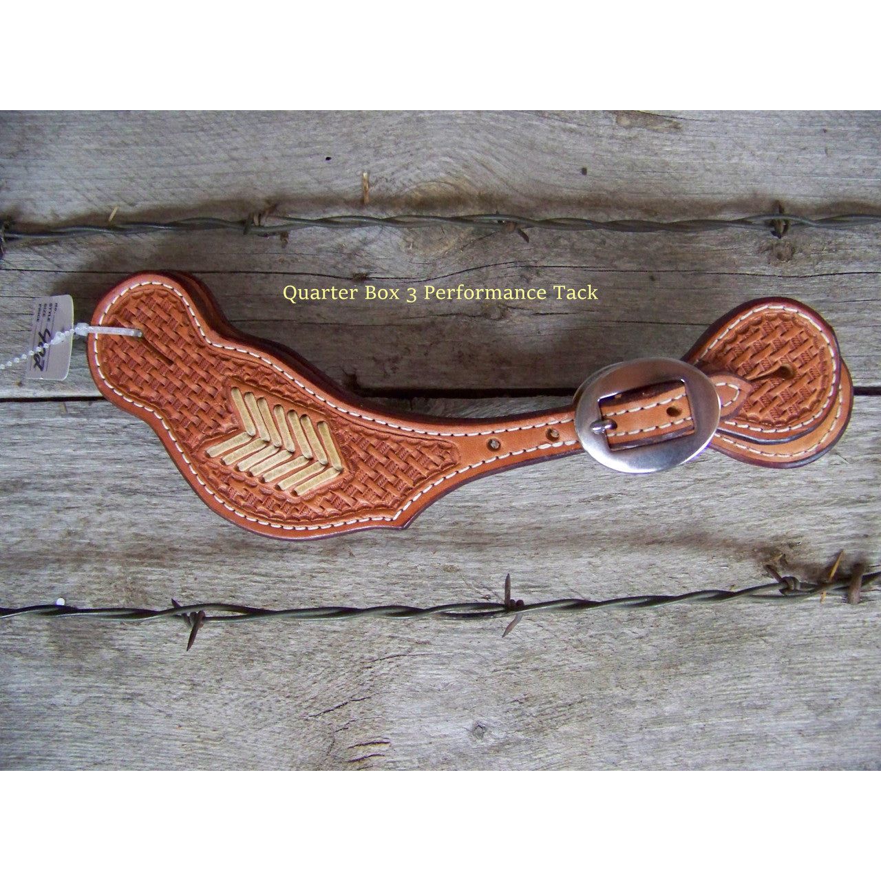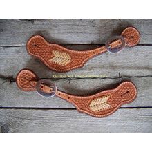 Men's wide basket weave stamped spur straps feature rawhide arrow braiding. Spur straps are lined and have stainless steel buckles. Available in natural and dark oil.