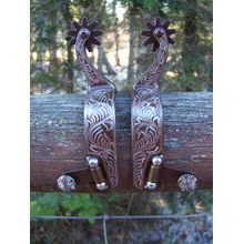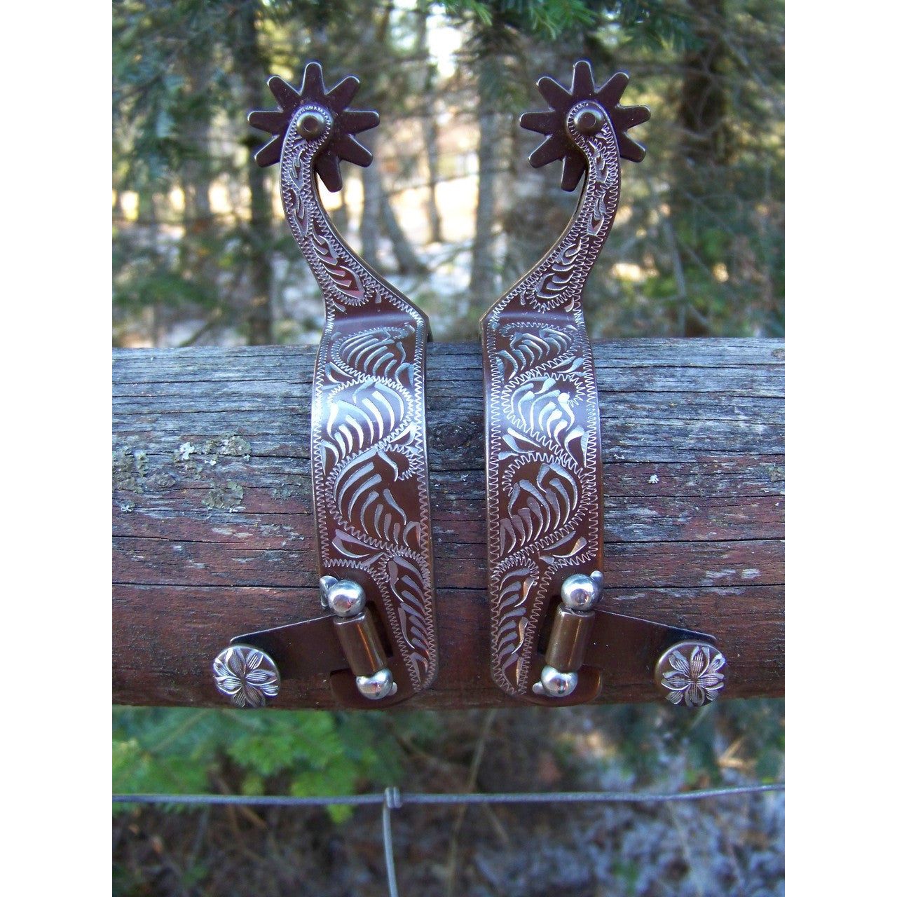 50th anniversary antique floral engraved spur for the lady.  1" band, 2" shank, and 9-point rowel provides a moderate effect.