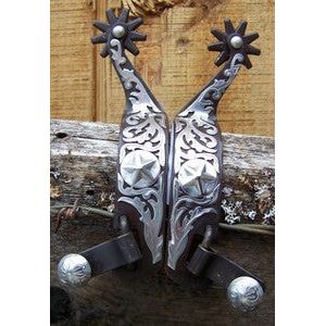 Star Concho Cowboy Collection Men's Spurs - Oval cup with a 1" band with stainless steel floral overlay and star concho.  Shank measures 2" and has 9 point 1 1/4" rowels.
