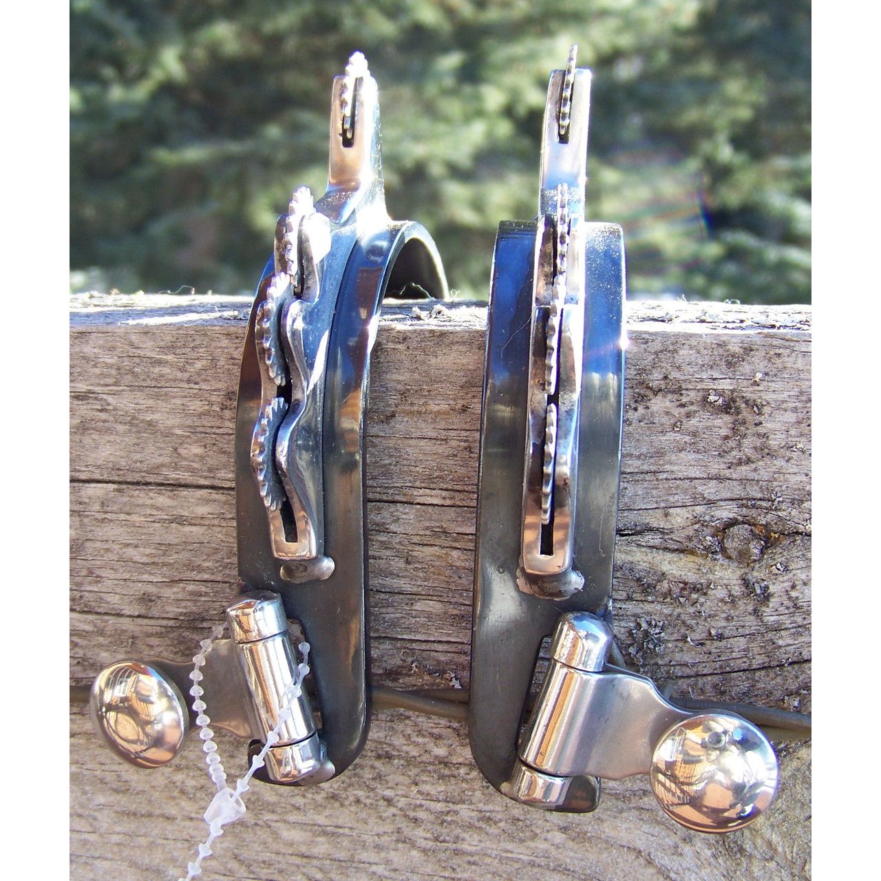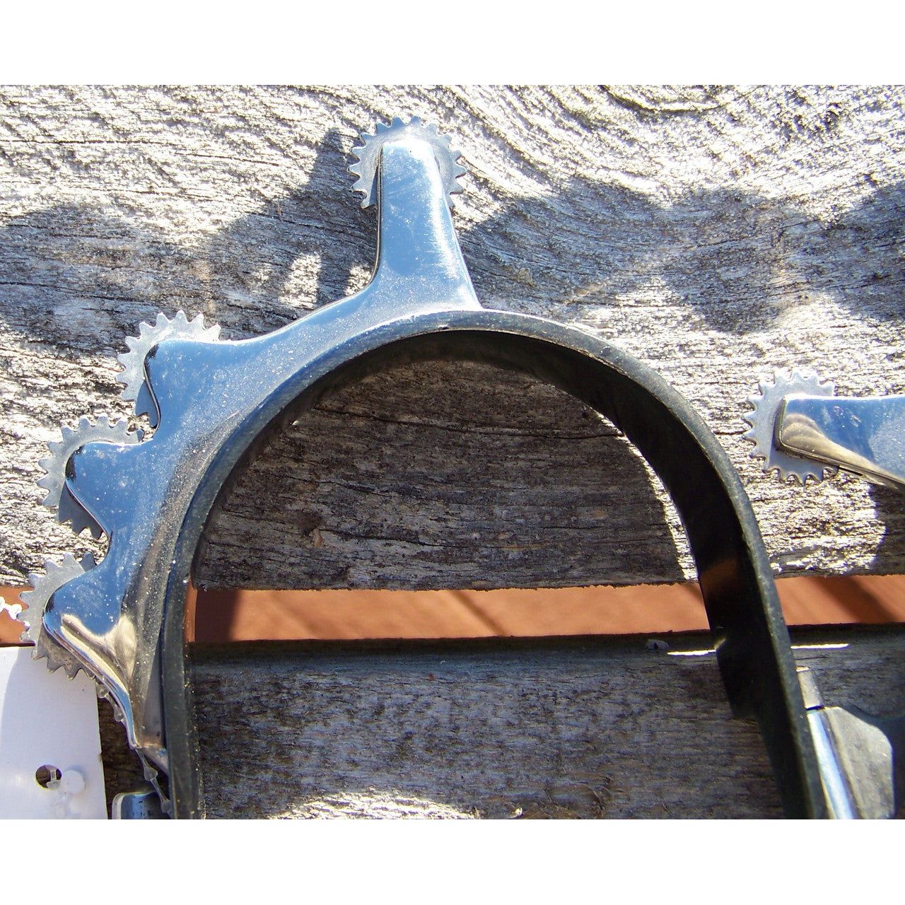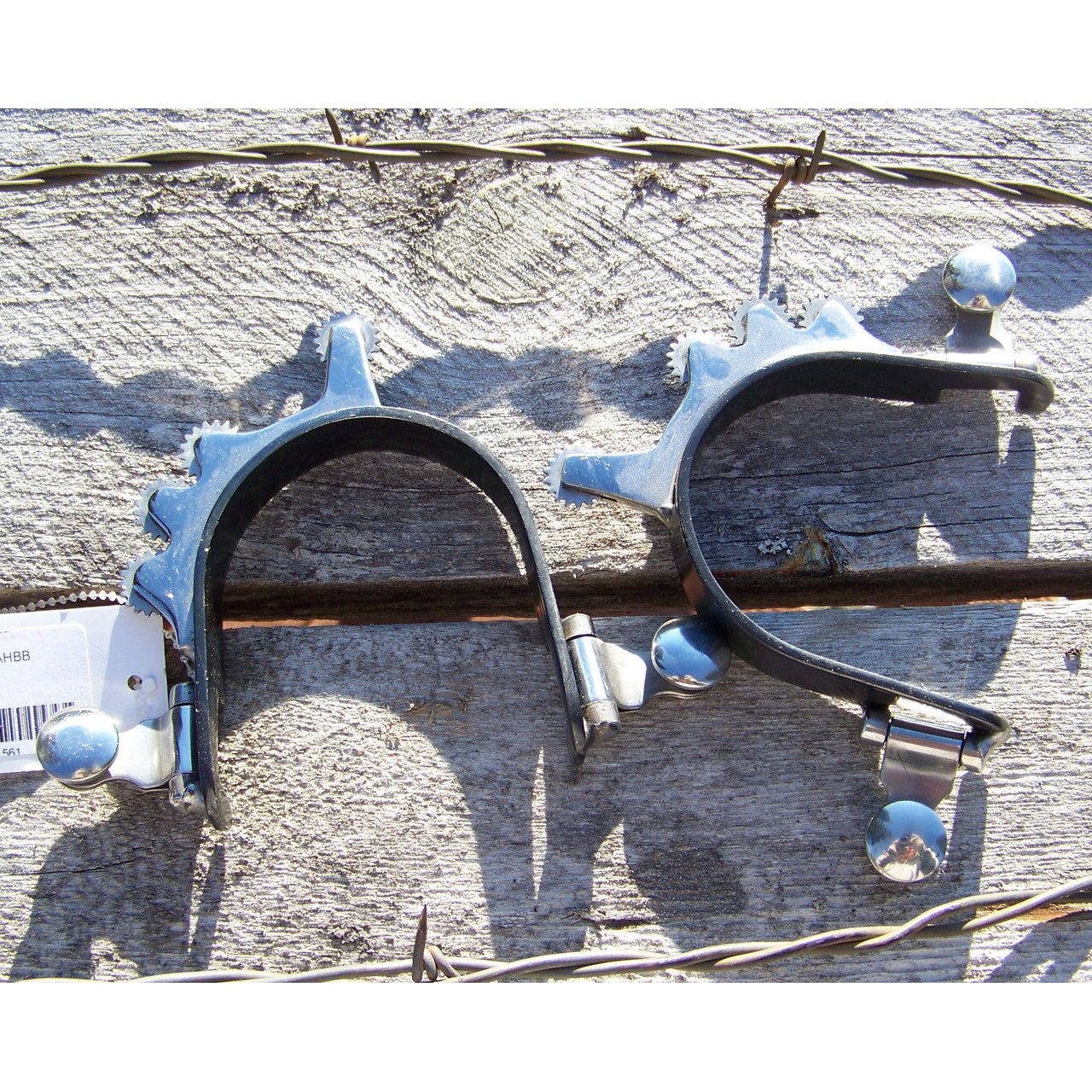 Black satin bumper spur with rowel for a strong affect. Band measures 5/8" thick, 2 1/2" spread for heel, and approximately 3" depth to sit on the heel.