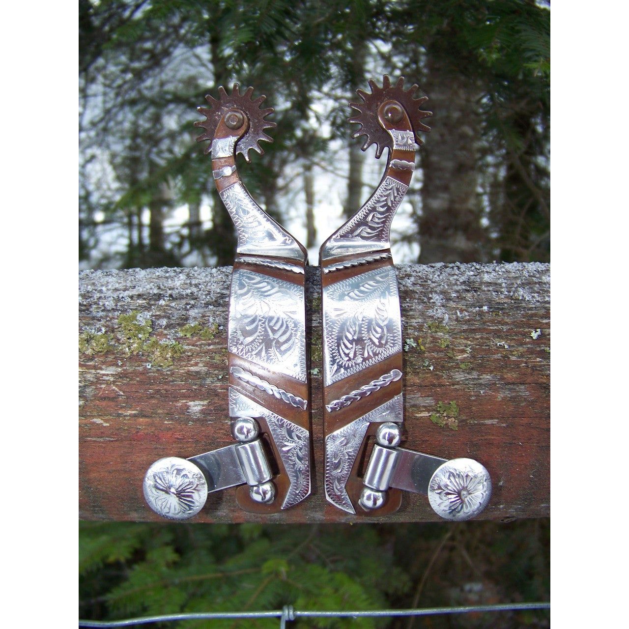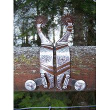 Francois Gauthier Antique Rock Grinder Training Spur - 7/8" band with stainless steel hand engraved trim and rope. 2 " shank. 1 1/4" rock grinder rowel. Provides a very strong effect.