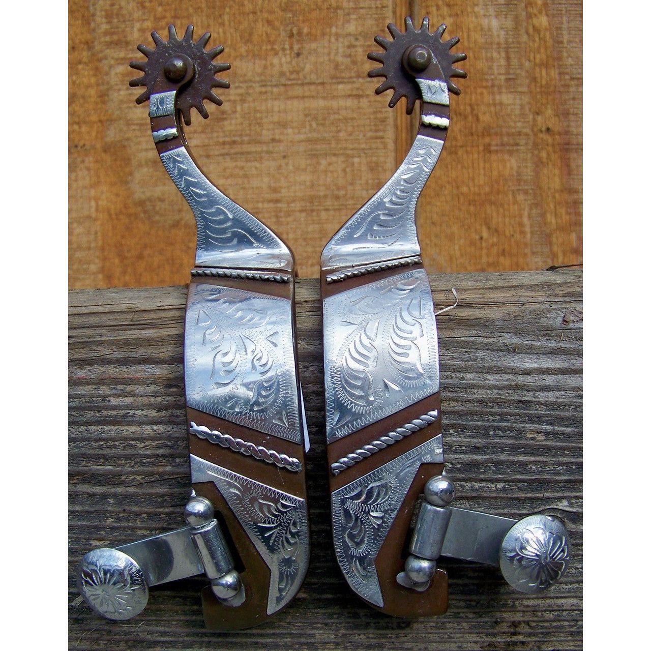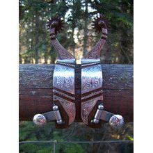 Francois Gauthier Antique Rock Grinder Training Spur - 1 1/4" band with stainless steel hand engraved trim and rope. 2 3/8" shank. 1 1/4" rock grinder rowel. Provides a very strong effect.