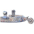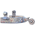 Polished Steel, half-mounted with flower design and copper dots. PCSP-500 pair. 1" band, 1 3/4" shank with 8 point rounded rowel and chap guard. 3" Boot Width.