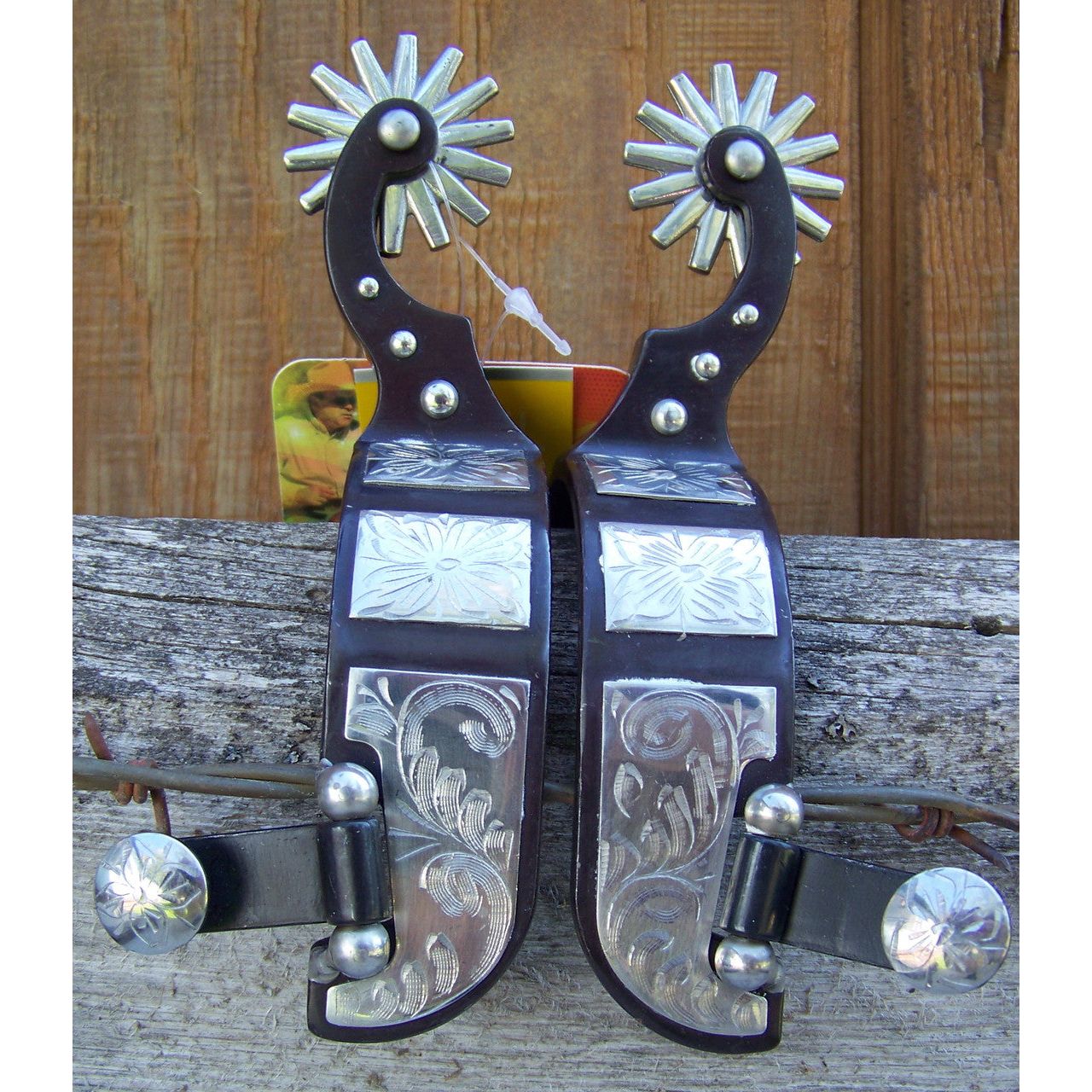 Mens's Francois Gauthier Black Satin Reining Show Spurs - 1 3/8" band with stainless steel engraved trim.  Gooseneck 2 1/4" dotted shank.  14 point 1 1/2" interchangeable rowels with E clips.