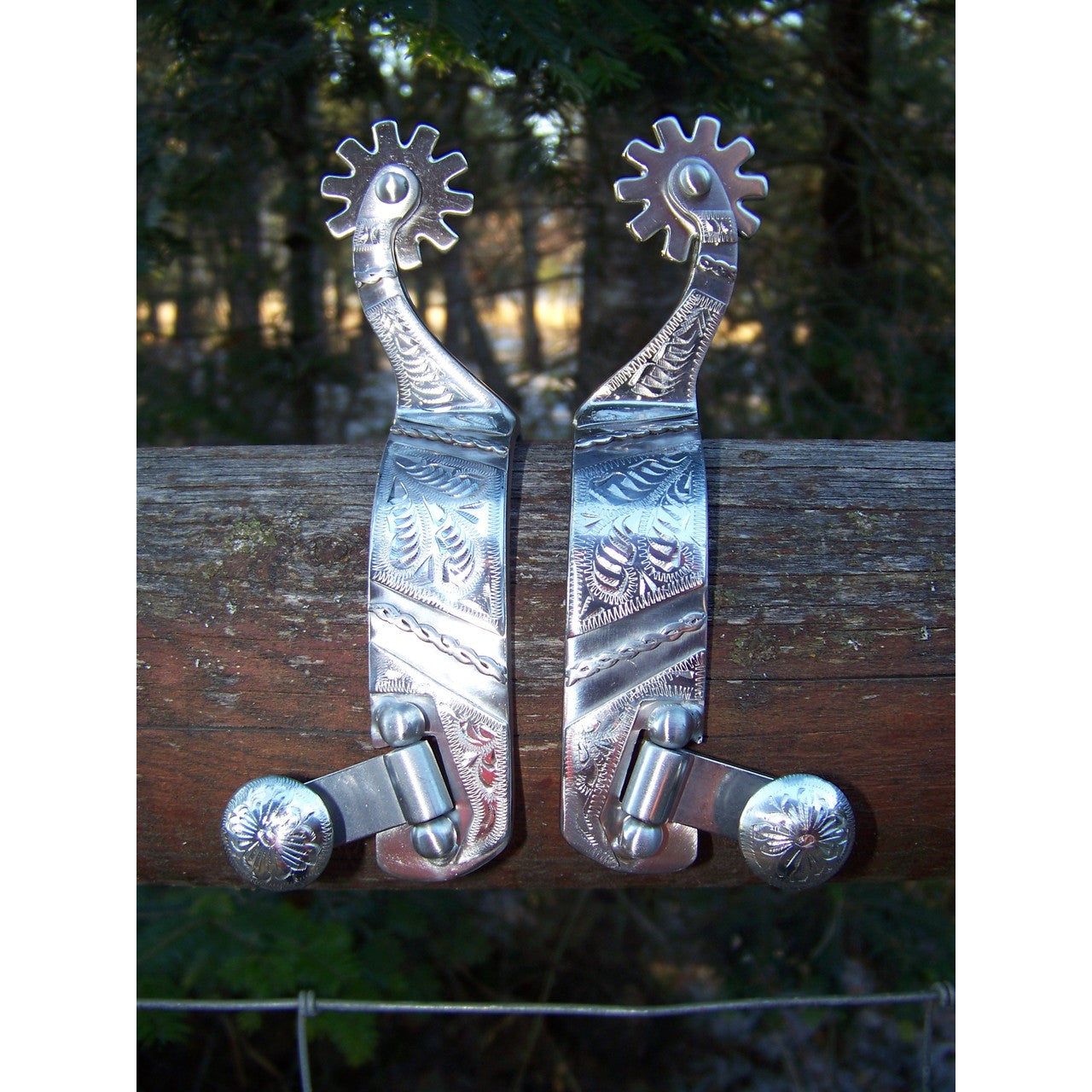 Stainless steel brushed show reining spur with silver trim and rope for ladies. 1 1/8" band, 2 3/8" shank, and 10-point rowel for a moderate effect.