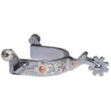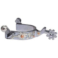 This spur has a decorative floral design on the 3/4" band and an 8 point rowel.