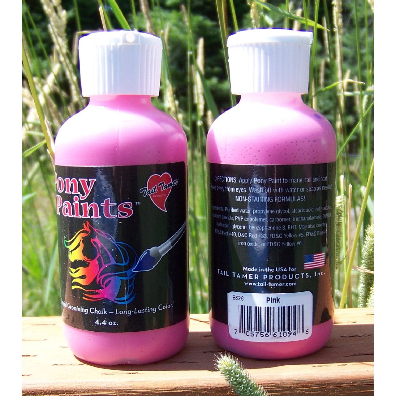 Let your imagination run wild! Pony Paints - Liquid Grooming Chalk - Long Lasting Color. Directions: Apply Paints to mane, tail and coat. Keep away from eyes. Wash off with water or soap as needed. Non-Staining Formula. Made in the USA for Tail Tamer Products. 4.4 ounce.
