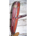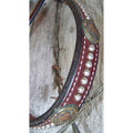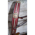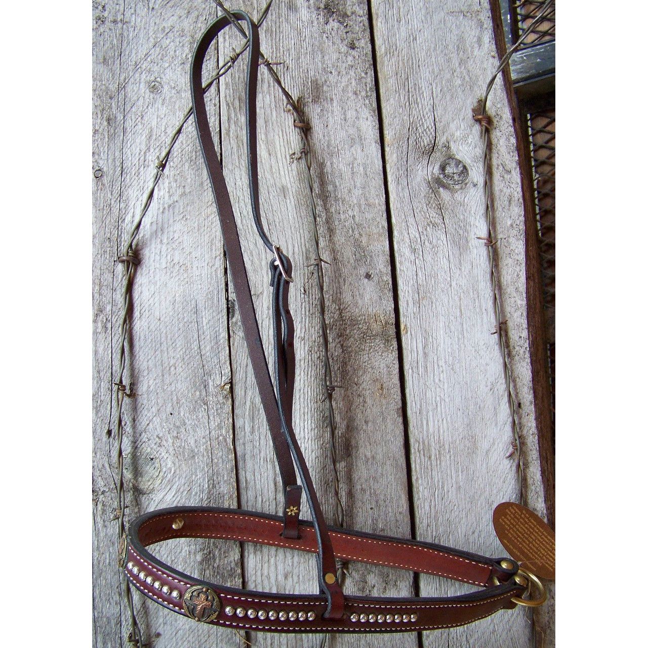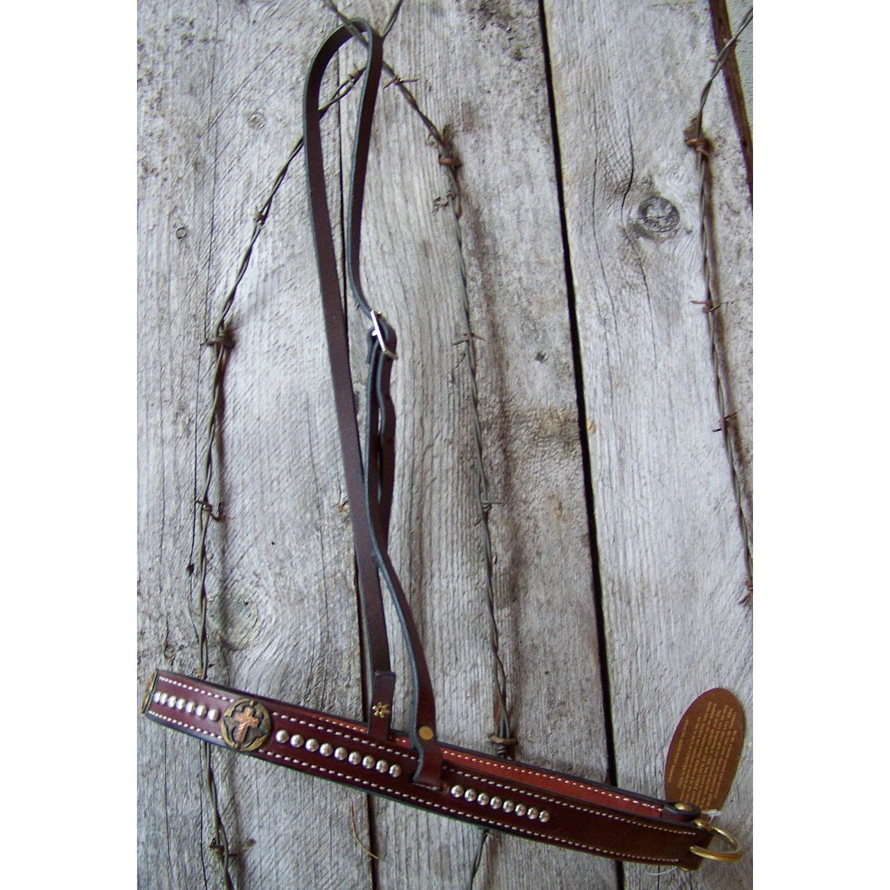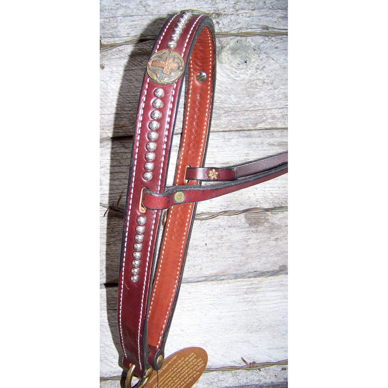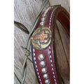 Three tri-colored custom cross conchos decorate this tie down noseband. Stainless steel dots are inserted inbetween the conchos. Caveson is lined to prevent rubbing on your horse. Hardware is brass to prevent corrossion from the weather.
