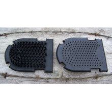 A brush & curry all in one! PVC/rubber bristles on one side for scrubbing and nubby surface for massaging/grooming on the other. Fits average hand.